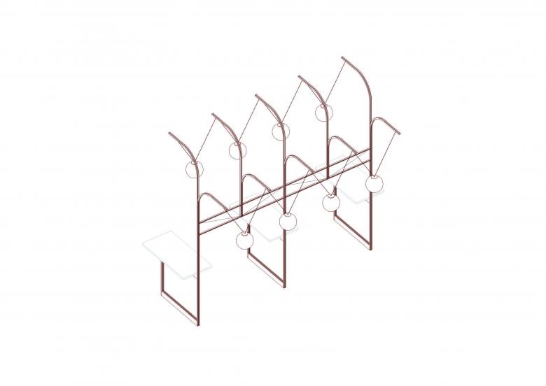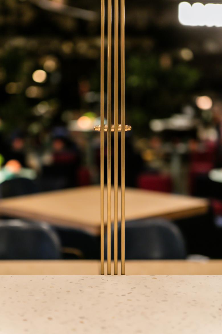 Likewise, the high table is supported by an equally delicate structure, combined with the central lighting fixtures to create a wholesome aesthetic while again maintaining the consistency of the curve. Simultaneously, the curvature above the bar plays along to construct an arched opening; framing a welcoming entrance for the visitors while enhancing the efficiency of the dining area.
