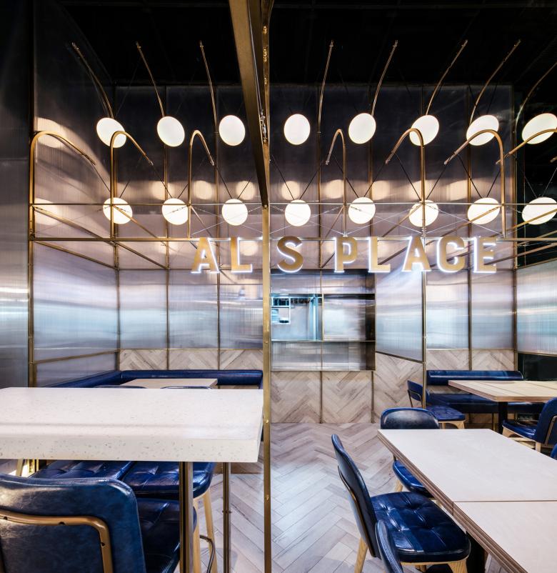 AL's Place, designed by dongqi Architects, creates a versatile space shaped through a spatial composition of 6mm thin steel structure, maintaining a consistent design vocabulary while scaffolding different seating variations from dining tables to high seating, and elegant bar areas.