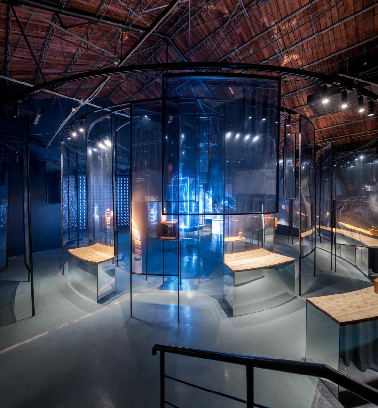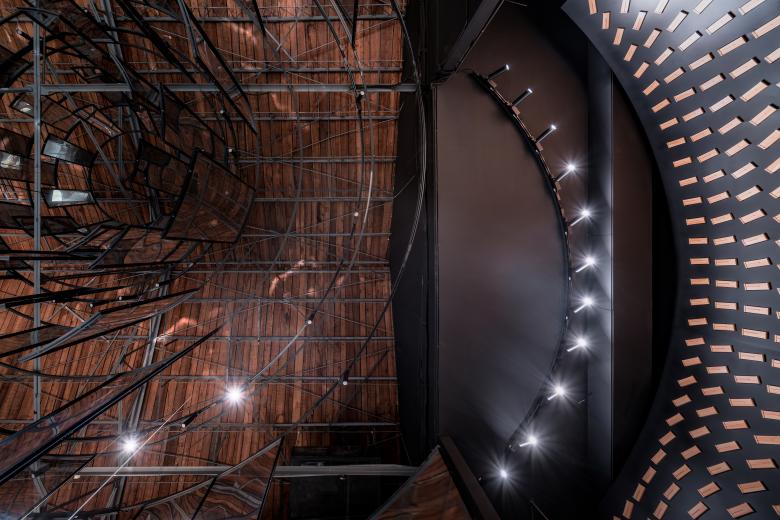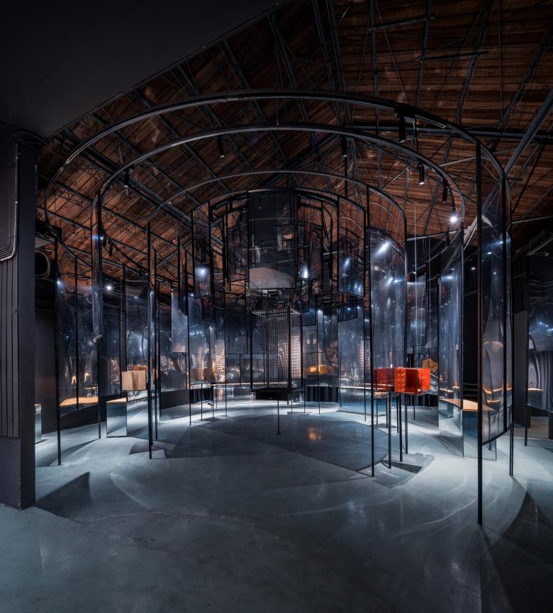 The original building is of typical industrial style. dongqi utilizes its unique floor height and builds a set of circular steel tracks, which rise along with the angled roof. Such structure creates a new arch space out of the original space. Moreover, all surface of the original space was painted black so that the outside boundary is blurred.