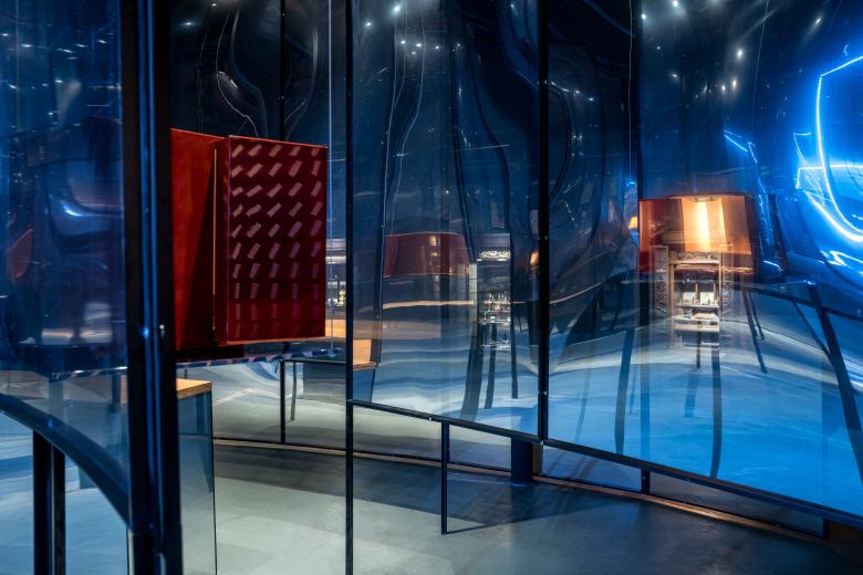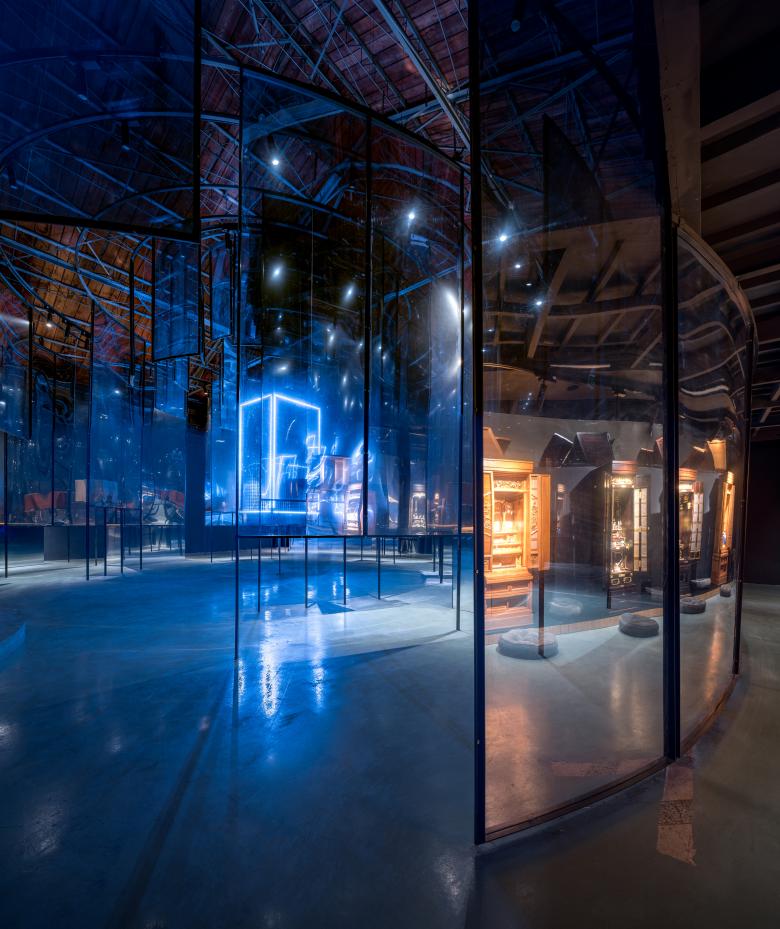 The light and shadow of the virtual digital Buddhist shrine reflect and refract the acrylic boards. As a result, the virtual Buddhist and illuminated shrines seem to appear at different locations from observations. When looking back, customers will see the reflection of themselves and the lit-up shrines behind them. As they move with changing lights, their perspectives shift between surroundings and reflected images as if the boundary of the virtual and the reality is blurred.