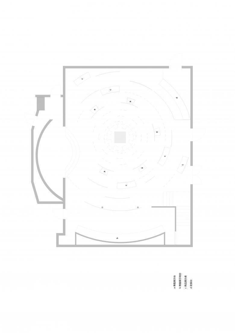 The store’s architectural concept starts from the center of a circle, which is slightly deviates from the true geometric center of the building space. From the center, rings of concentric circles rise the one out of the other, propagating themselves like waves. After intricate calculation by dongqi Architects, the original two steel pillars of the industrial building are aligned at one ring of the circles. The arch between the pillar becomes a semi-transparent wall that divides the space into different sizes of spaces for shrine exhibition. Several parts of the old arch stairs are deliberately preserved by dongqi, as they bounce into the newly generated centric circles, presenting the collision of the new and the old.
