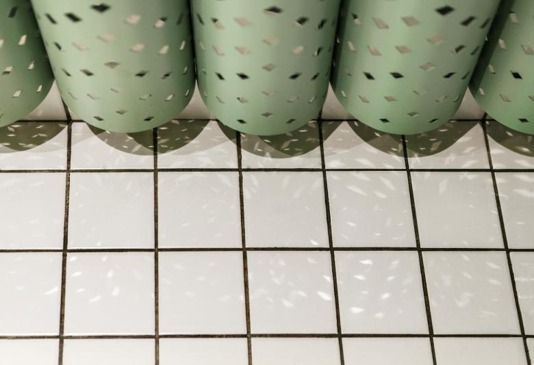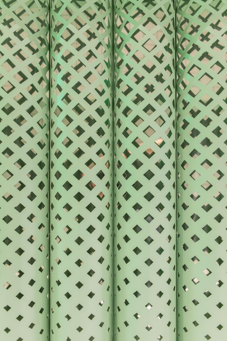One of the main design elements is the stainless steel sheet, which is sprayed with cautiously selected green. Laser-cutting the pattern out as well as the connections and bending the sheet into specific shape in the factory helped minimize the work at the site. The gradient pattern generated via computer programming gives this tough material a soft feeling and textile texture. The contrast between the curvature and the toughness of the material is strong, eye-catching, and fascinating. They are bent into semi-cylinders and put abreast. Therefore, the dynamic movement of the pattern and the sense of order give an interesting balance in the space and help create an artsy atmosphere.