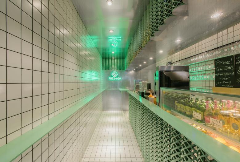 The FRESHIGH designed by dongqi Architects is located on South Shaanxi road, in the center of Shanghai. The primary task in this project is to renovate the retail store into an appealing space to attract more customers and let it merge into the surroundings. At the end, it was turned into a refreshing space with soft green color filled all around. Hiding in the historic neighborhood, the designer hopes that it could give a surprise to the people passing by. They could stop and relax for a cup of fresh juice, and then go back to daily life.