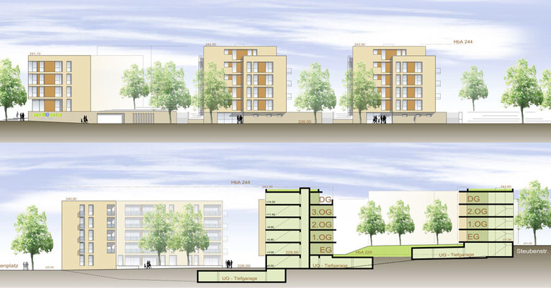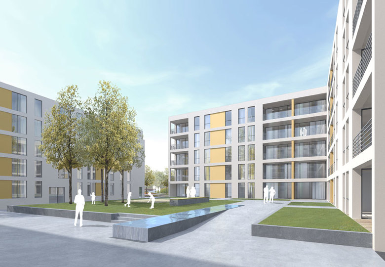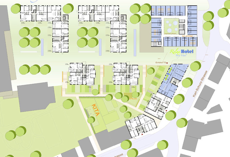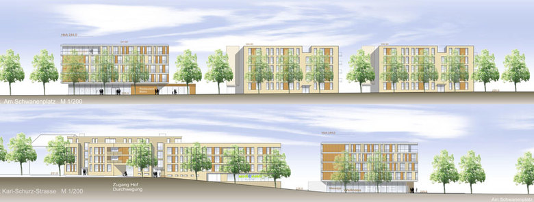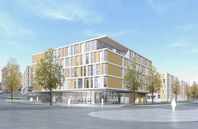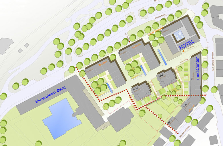 Vorentwurf für die Neubebauung einer heute als Parkplatz genutzten Grundstücksbrache zwischen den Minderalbädern Leuze und Berg entlang des Schwanenplatzes. Das Nutzungsprogramm des Neuen Quartiers umfasst ein 4-Sterne-Hotel, ein Medicenter mit Praxisflächen, eine 3-zügige Kindertagesstätte sowie Wohnungen.