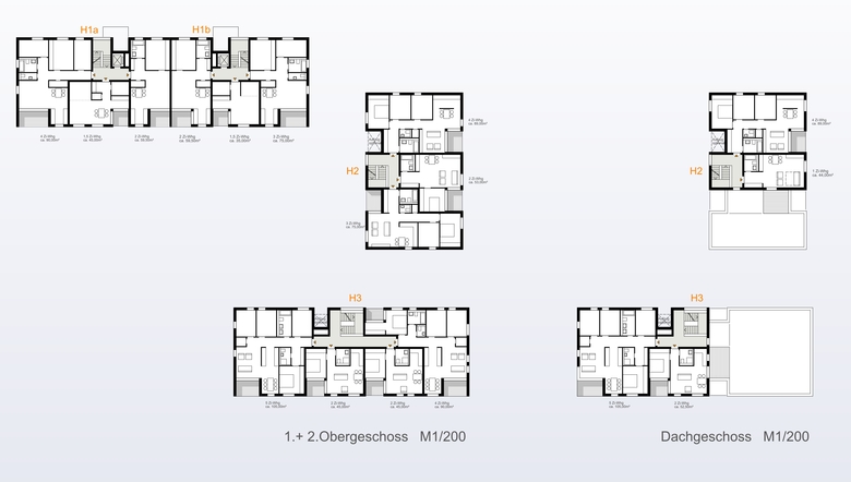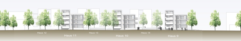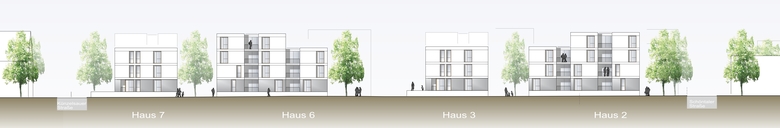 Den insgesamt 14 Häusern in beiden Teilbereichen des Wettbewerb-Areals liegen vier Basistypen zu Grunde, die in Hinsicht auf Gebäudebreite und Wohnungsmix flexibel an die entsprechende Situation angepasst werden können. Die differenzierte Höhenstaffelung in Verbindung mit fugenartigen Rücksprüngen im Bereich der Treppenhäuser, Loggien- und Dacheinschnitte sowie variierende Putzfarben bewirken eine ausgeprägte Gliederung der Häuser. Das Volumen der bis zu 37 Meter langen und im Mittel 13 Meter tiefen Geschossbauten wird in Kubaturen unterschiedlicher Höhe, Breite und Farbtönung aufgelöst, was die maßstäbliche Einbindung der Neubauten in das kleinteilige Ortsbild entlang der Straßenzüge und den Raumkanten des öffentlichen Grünzugs unterstützt.
