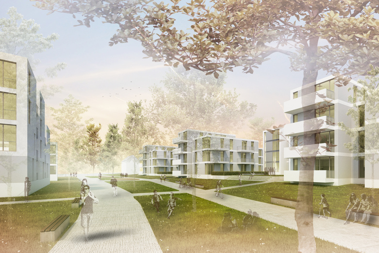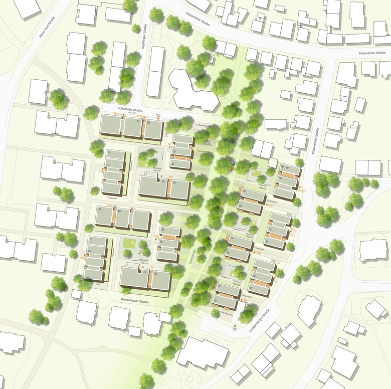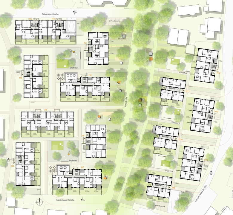 Kern des städtebaulichen Ordnungsprinzips in beiden Teilbereichen des Areals ist die kontinuierliche Abfolge von privaten Wohnhöfen - jeweils eingefasst von offenen Gebäudegruppen mit überschaubaren Nachbarschaften, sowie untereinander verbunden über ein Netz von privaten und halböffentlichen Wegen. Das Geflecht aus zueinander versetzten Wohngebäuden und Hofflächen schafft spannungsvolle Räume und Begegnungsorte für die Quartiersbewohner.