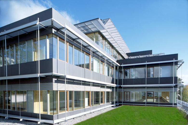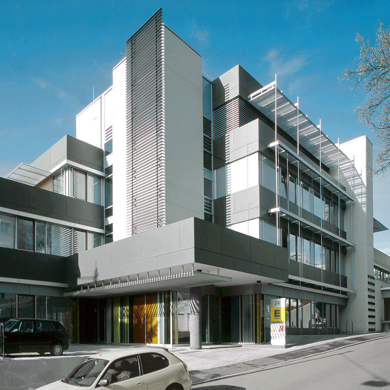 Bandrasterdecken in den Büroflächen ermöglichen eine flexible Raumaufteilung. Während sommerlicher Temperaturspitzen können bei Bedarf in die Deckenkonstruktion integrierte Kühlfächer zugeschaltet werden. Über die Gebäudeleittechnik können Kühlfächer und ringförmig verlaufende Elektro- bzw. EDV-Leitungen den einzelnen Büroräumen individuell zugeordnet werden.