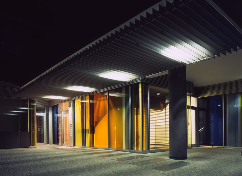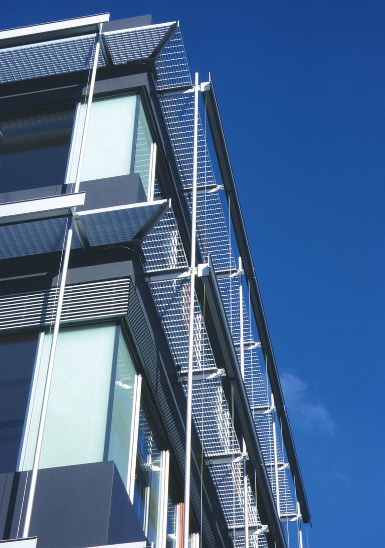 Die neue Brüstungsverkleidung aus schwarz durchgefärbten Faserzementtafeln steht im Kontrast zur Pfosten-Riegel-Fensterkonstruktion aus Birkenschichtholz. Die vorhängte Aluminium-Lisenen-Konstruktion übernimmt als zweite Fassadenschicht die Funktion des flexiblen Sonnenschutzes. Über die eingehängten Laufroste lassen sich die Fassadenflächen leicht warten und reinigen. Die umlaufenden, feststehenden Sonnenschutzroste in den Attikaebenen betonen zusätzlich das horizontale Gefüge des Gebäudes und sorgen für einen filigranen Dachabschluss.