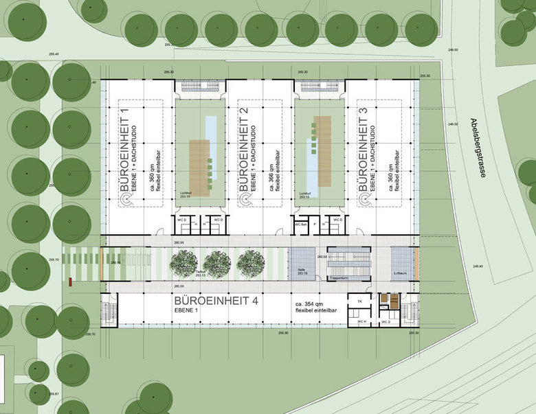 Der Neubau umfasst drei Büroetagen, ein zurückgesetztes Dachgeschoss sowie ein Tiefgaragengeschoss mit Lagerräumen. Die kammartig zwischen Lichthöfen angeordneten Büroflächen sind flexibel unterteilbar und können mithilfe interner Treppenhäuser auch über mehrere Geschosse hinweg miteinander gekoppelt werden. Der Hauptzugang in die zentrale Eingangshalle befindet sich an der Ecke Hack- und Abelsbergstraße direkt gegenüber der Stadtbahnhaltestelle.