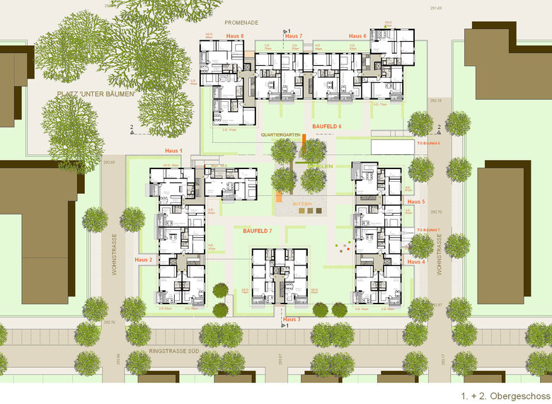 Städtebaulich betrachtet, bilden die Baufelder 6 und 7 ein zusammenhängendes Quartier. Die einzelnen Gebäudeteile umschließen einen großzügigen, zentral gelegenen Innenhof, dessen Wegenetz und Freizeiteinrichtungen beide Baufelder miteinander verbinden. Im Mittelpunkt befindet sich der gemeinschaftlich genutzte 'Quartiersgarten', der zum Spielen und Verweilen einlädt.