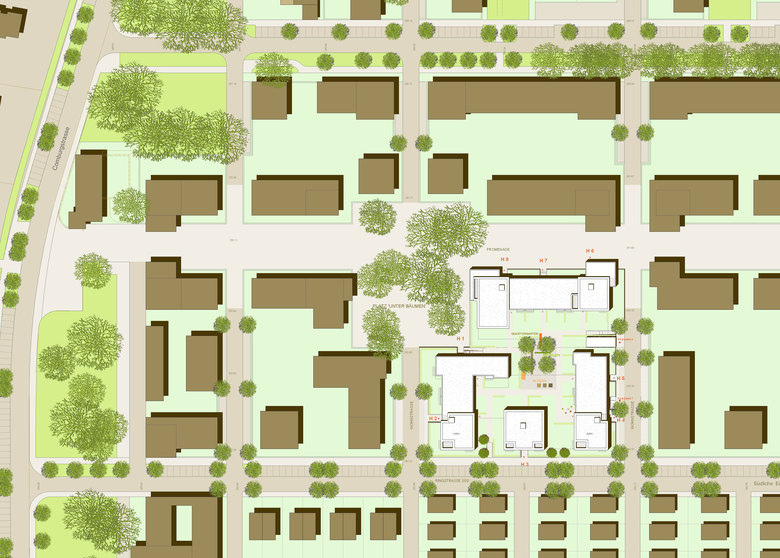 Gebäudestellung und -Geometrie, Geschossigkeit, Dachformen, Sockelausbildung und andere typologische Details sind zum einen durch Baulinienfestsetzungen im Bebauungsplan und andererseits durch die Vorgaben des Gestaltungsleitfadens exakt beschrieben und festgelegt. Die Abfolge von drei- und viergeschossigen Gebäudeabschnitten und die ausgeprägten Vor- und Rücksprünge in den Fassadenabwicklungen unterstützen die Raumbildung entlang der angrenzenden öffentlichen Erschließungswege, Innenhöfe und Plätze.