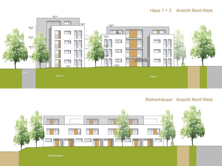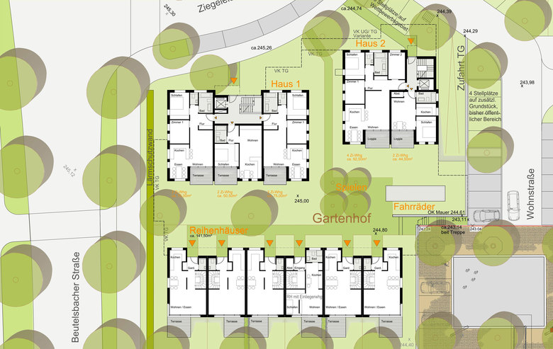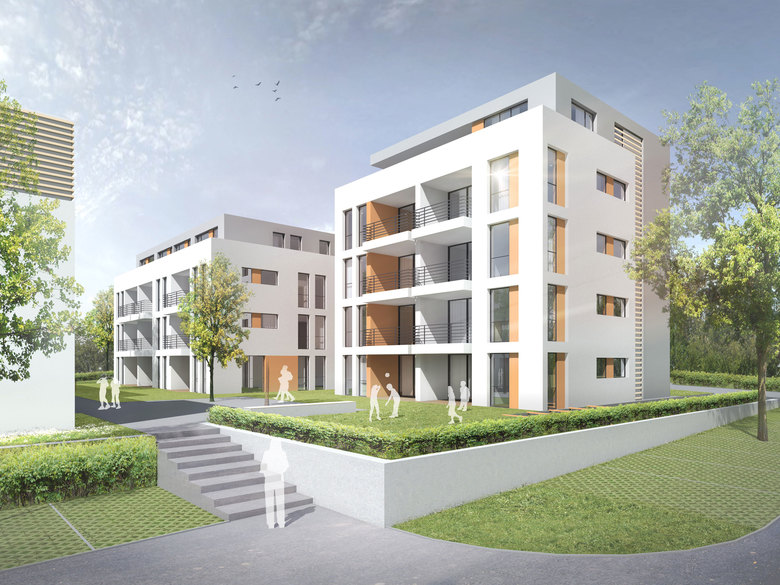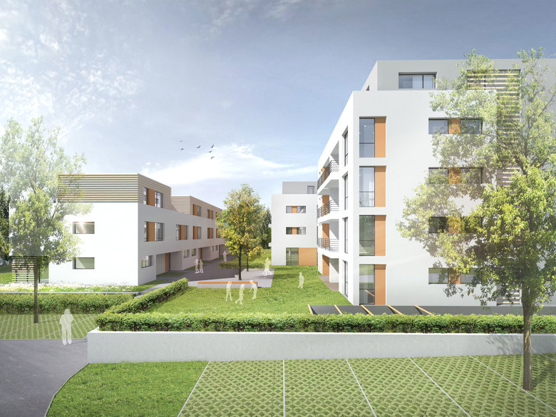 Der Idee des städtebaulichen Konzepts folgend, bildet die aus zwei Mehrfamilienhäusern sowie sechs Reihenhäusern bestehende Wohnanlage ein Ensemble aus drei Baukörpern, die einen zentralen, gemeinschaftlich genutzten Gartenhof umschließen.