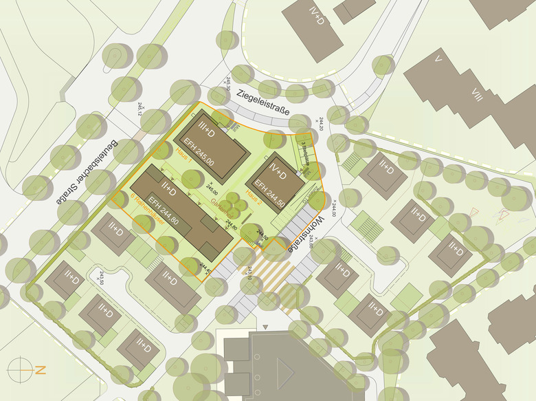 Die Mehrfamilienhäuser werden im System von Zwei- bzw. Dreispännertypen organisiert. Beide Häuser verfügen über einen Aufzug und sind in allen Geschossen barrierefrei erschlossen. Ihre Hauszugänge orientieren sich zur Ziegeleistraße hin. Die Zugänge der Reihenhäuser sind vom innenliegenden Gartenhof aus erreichbar.