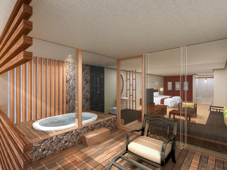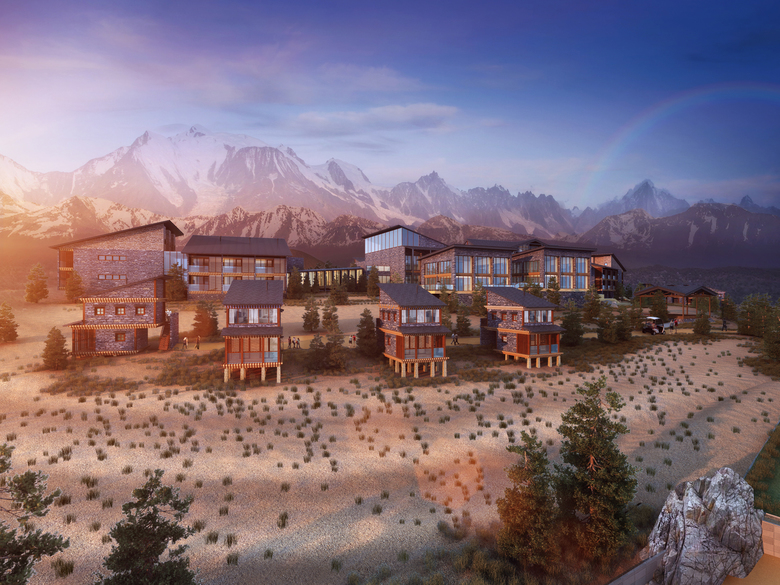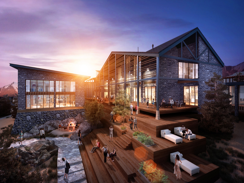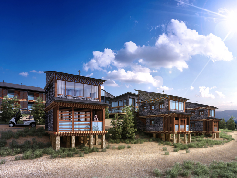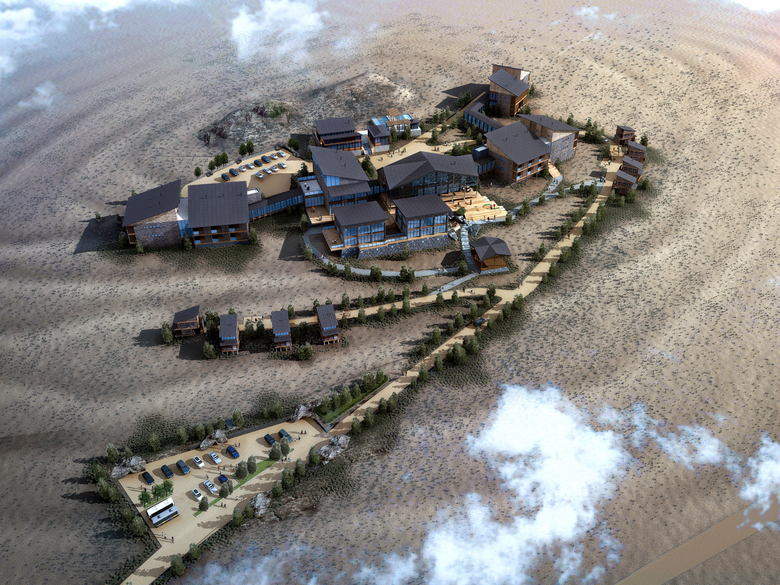 それを一望する斜面に36室の滞在型ホテルを計画する。地域の伝統文化への配慮、保全を念頭に持続可能なアプローチを求めて、基本的に全て木造の高床式建築を分散させている。全ての開口部は眺望を取り込むように配置され、広いテラスとビューバスを備え、給湯設備、照明、下水処理などにソーラーを始め、最先端技術による自然エネルギー活用に積極的に取り組んでいる。宿泊棟を屋内連絡通路で結び、気候の厳しいシーズンに対応するほか、コテージ棟はプライバシーを確保しつつ、程よい距離を保ちながら、それぞれ長期滞在が可能なしつらえを有する。