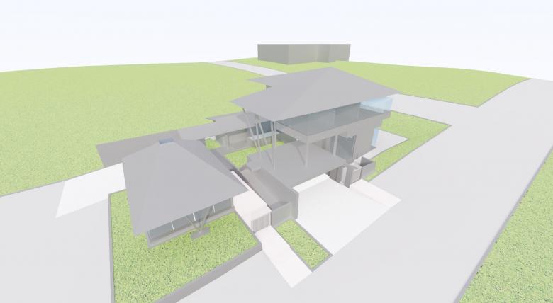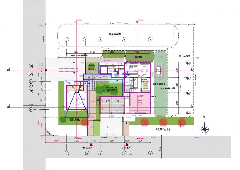 発想とコミュニケーションをインスパイアする空間を目指す本施設は母屋とアネックスで構成される。二棟は中庭を介して通路デッキで一体化されており、それぞれの利用目的に応じた使用が可能となっている。計画地周辺はなだらかな傾斜地であり、一棟とした場合高低差が生じるというデメリットを分棟とすることで敷地と樹林に馴染ませている。一方で厳寒期や梅雨の移動は不自由と感じるかもしれない。しかし建築の狙いは移動にある。移動にともない四季折々の眺望がシーンとして目に入ってくる。それらがシークエンスとなって脳に心地よい刺激が加わる。