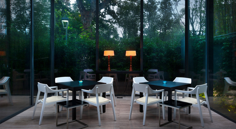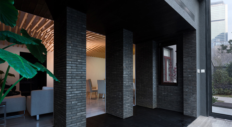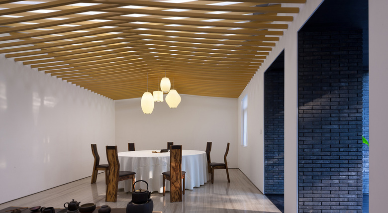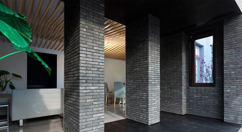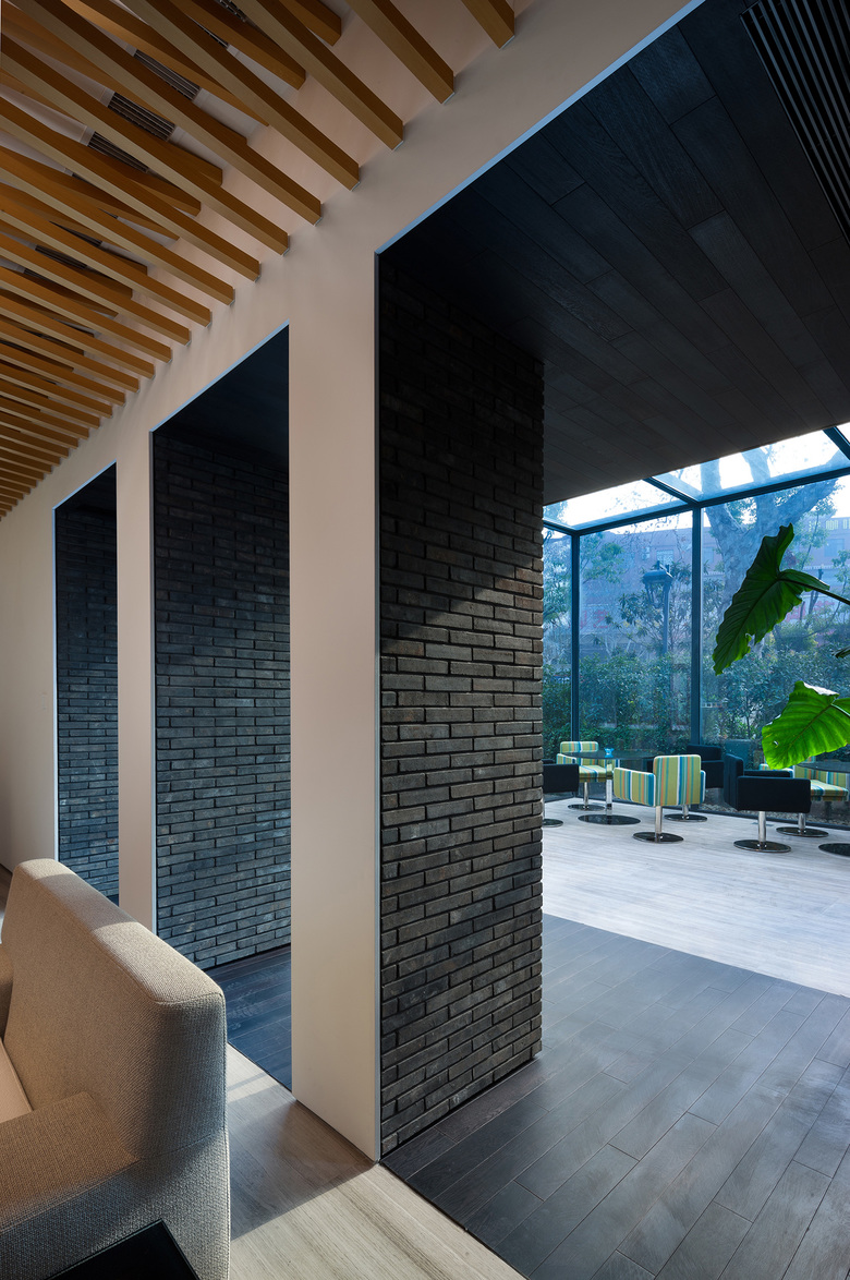 To lift ceiling of the dining area, we used a wooden grid system to create a pinnacle. Sunlight falls through the grid, not only inducing a mild and cozy feeling, but also decreasing the sense of oppression. From the winter garden to dining and service areas, light and shade cascade the various materials. Beige natural stone compliment the rustic brick, the primitive ebony and contemporary white walls. A Mix and match of multiple materials make the traditional style and tone of the buildings origin, integrate with a more modern design philosophy.