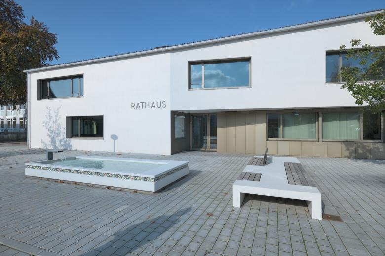 Ein mächtiger Ahorn als Rathausbaum und der Rathausbrunnen im Vorfeld des Rathauses markieren und prägen den Rathausplatz im innerörtlichen Gefüge. Sie stehen in geometrischer Beziehung zur Foyerzone und bilden den „Vorraum“ des neuen Rathauses. Ein Sitzmodul lädt zum Verweilen ein. Für die Herstellung der Platzfläche wird ein gesägtes, gehfreundliches großformatiges Granitpflaster vorgeschlagen.
