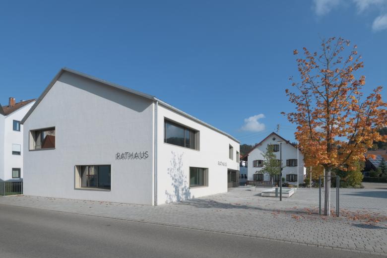 Der neue Baukörper übernimmt die Ausrichtung der Nachbargebäude und wird unter Berücksichtigung der möglichen Abstandsflächen im Norden des zur Verfügung stehenden Grundstücks situiert. Das Rathaus präsentiert sich ortstypisch giebelständig an der Hauptstraße. Nach Süden wird eine großzügige Platzbildung ermöglicht, die plastisch gegliederte Eingangsfassade wird dadurch von Süden kommend freistellt.