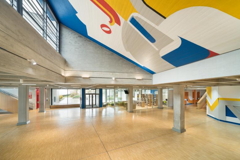 Im Gebäude findet sich die künstlerische Gestaltung durch Manfred Mayerle. Der heute noch aktive Künstler gestaltete sämtliche Innentüren und viele Wandflächen stark farbig und von identitätsstiftender Prägnanz. In der Aula befindet sich an der Rückwand ein plastisches Relief aus gefasstem Beton. Die Treppenhauswände, Heizkörper und Innentüren sind in strahlenden Farben mit geometrischen Formen gestaltet. Obwohl das Gebäude nicht in der Denkmalliste eingetragen ist, geht die vorliegende Planung sehr bewusst mit diesem künstlerischen Erbe um. Der Umgang mit der signalhaften Ausmalung aller Verkehrsflächen und dem farblich gefassten Betonrelief in der Eingangshalle wird mit dem Urheber Atelier Mayerle abgestimmt.
