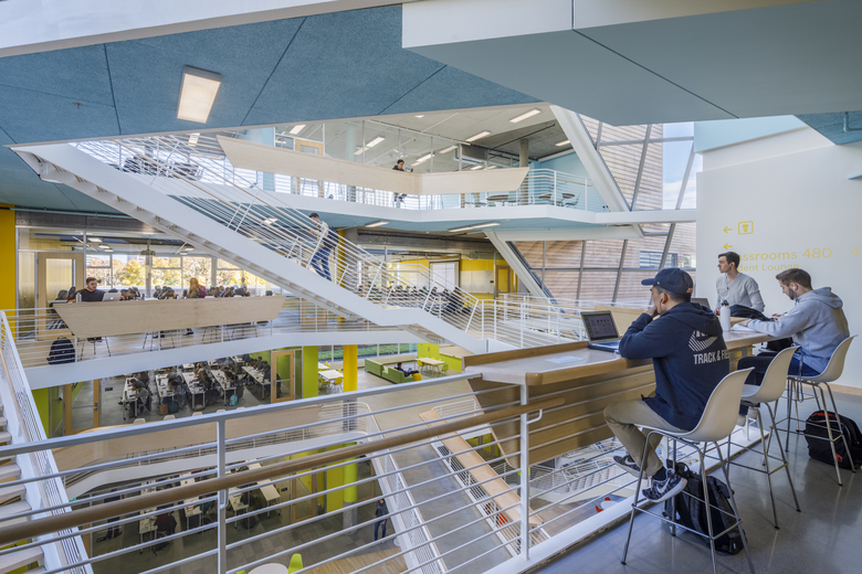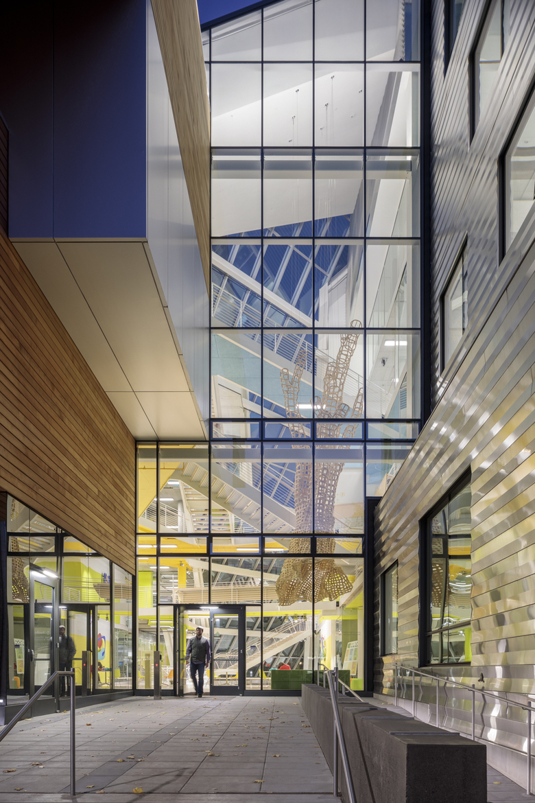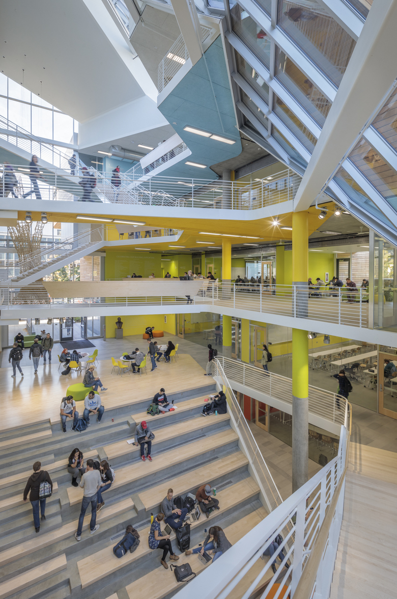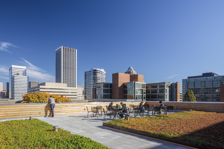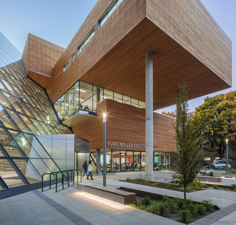 Located in downtown Portland, the new Karl Miller Center is uniquely integrated with the city’s rich network of public open spaces and diverse urban uses. Rejecting the full-block archetype that dominates the city blocks, the building design appears as two distinct structures sharing a city block. The 1970's structure retrofitted with a metal panel facade system broken up by an irregular composition of punched windows, and a new dynamic, shifting 45,000 sq.ft. addition, clad in regionally sourced Alaskan Yellow Cedar. This approach, coupled with a series of terracing external green spaces and new circulation pathways linking the urban center, local parks, transportation stops, and nearby campus buildings, enhances the public realm by providing a more diverse streetscape. A one-story grade differential between 6th Avenue and Broadway, populated with public oriented spaces, creates two ground levels, further activating the exterior plazas and the atrium and heightening the activity within and around the building.