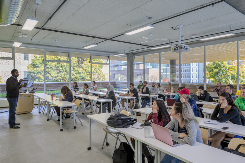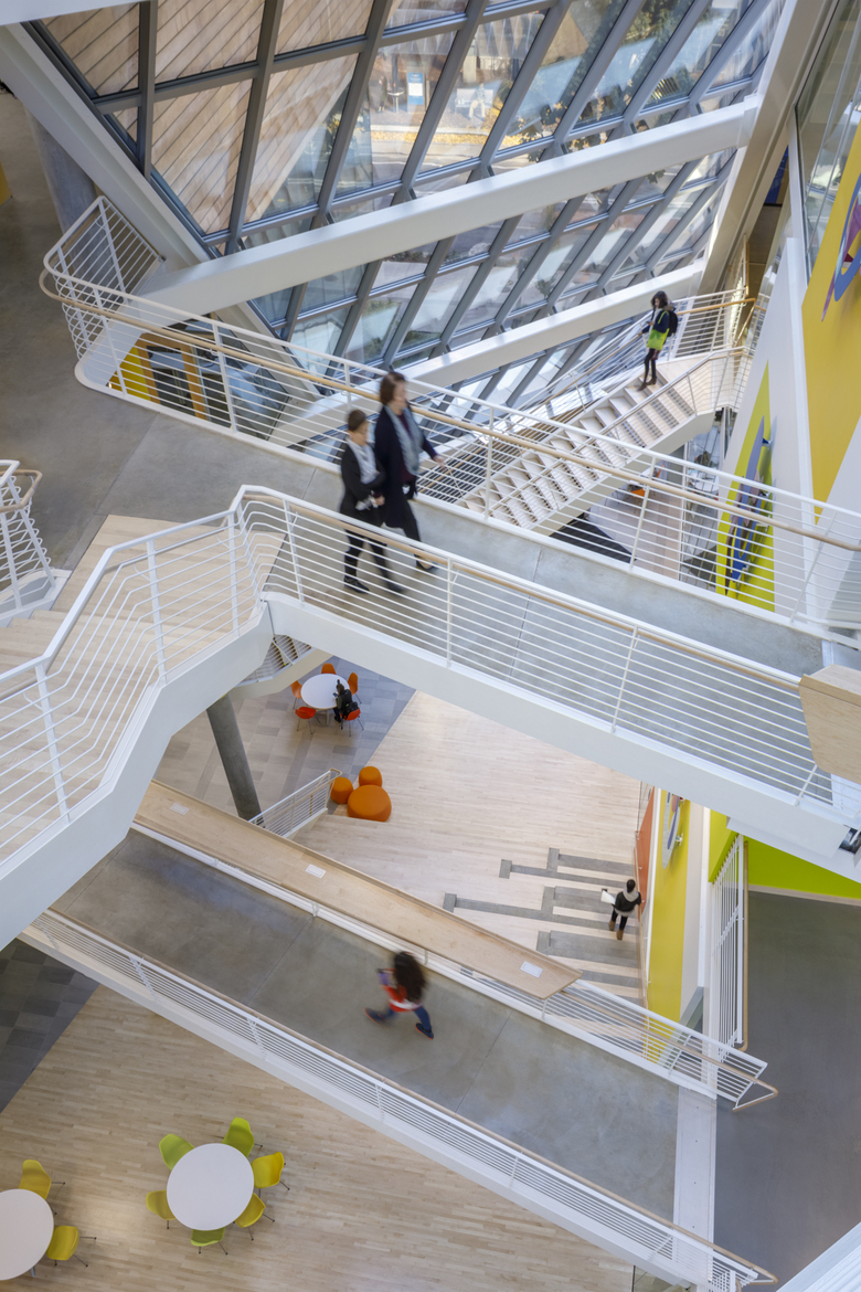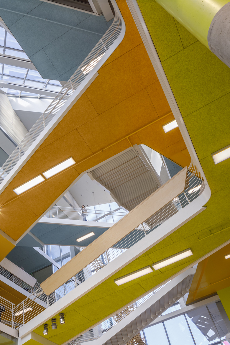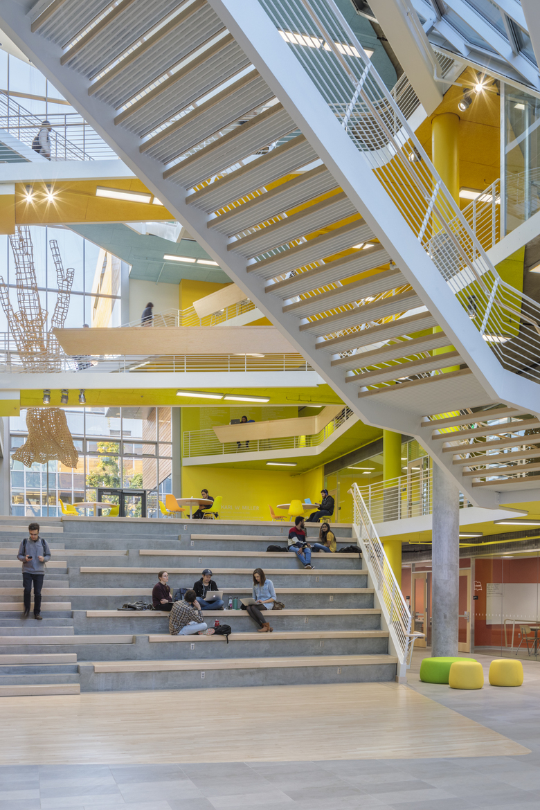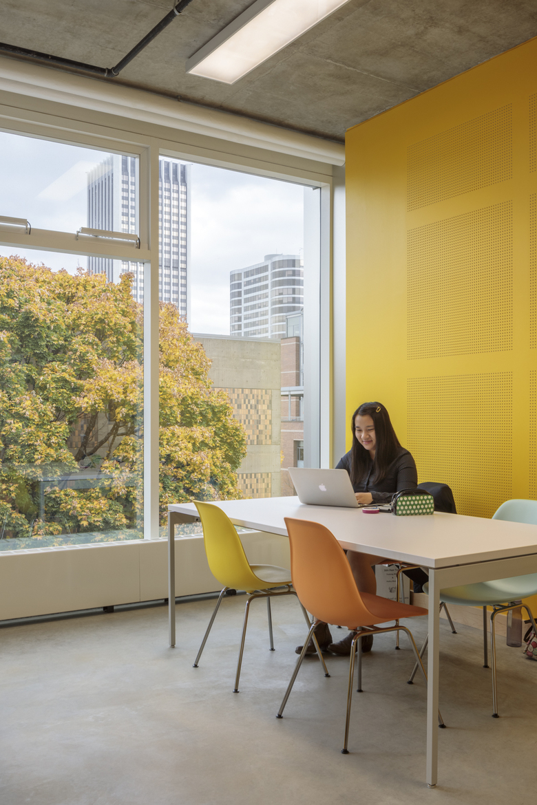 Located in downtown Portland, the new Karl Miller Center is uniquely integrated with the city’s rich network of public open spaces and diverse urban uses. Rejecting the full-block archetype that dominates the city blocks, the building design appears as two distinct structures sharing a city block. The 1970's structure retrofitted with a metal panel facade system broken up by an irregular composition of punched windows, and a new dynamic, shifting 45,000 sq.ft. addition, clad in regionally sourced Alaskan Yellow Cedar. This approach, coupled with a series of terracing external green spaces and new circulation pathways linking the urban center, local parks, transportation stops, and nearby campus buildings, enhances the public realm by providing a more diverse streetscape. A one-story grade differential between 6th Avenue and Broadway, populated with public oriented spaces, creates two ground levels, further activating the exterior plazas and the atrium and heightening the activity within and around the building.