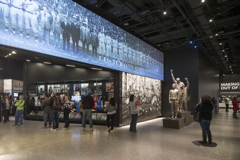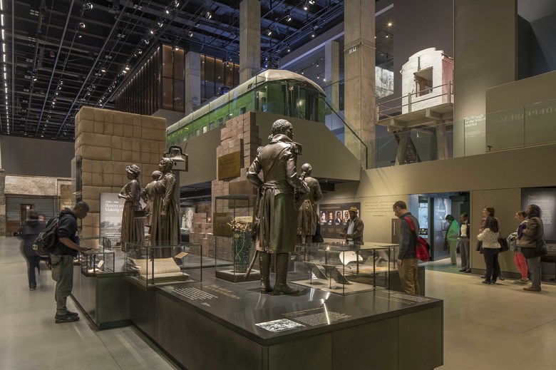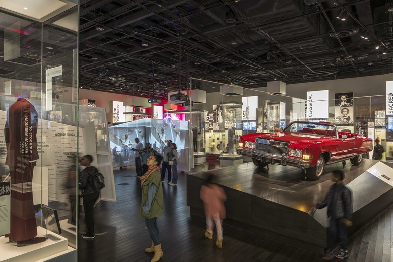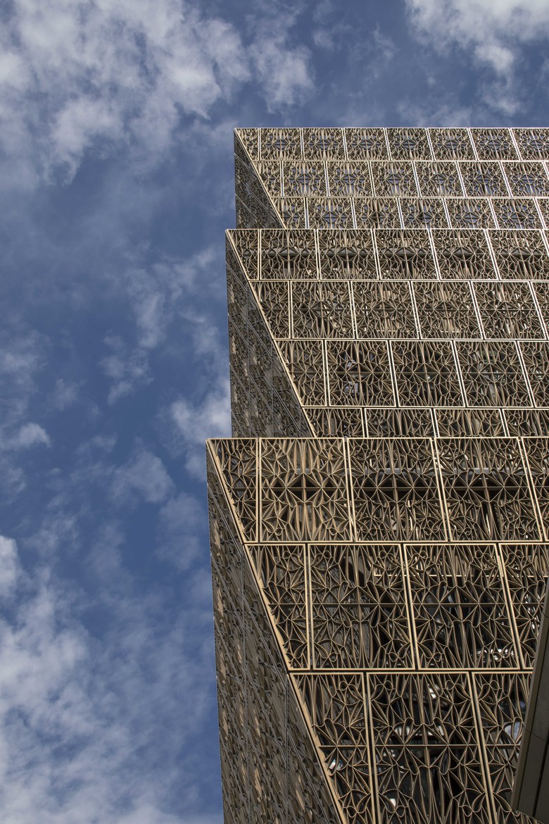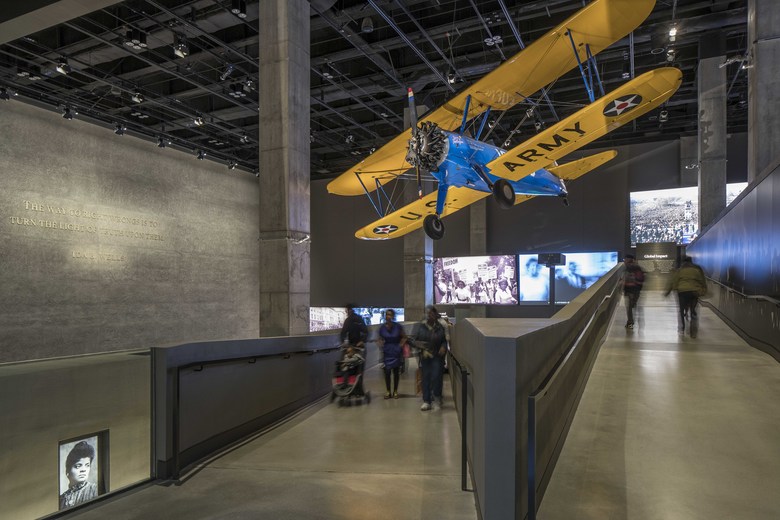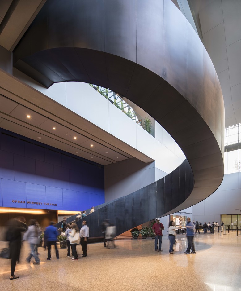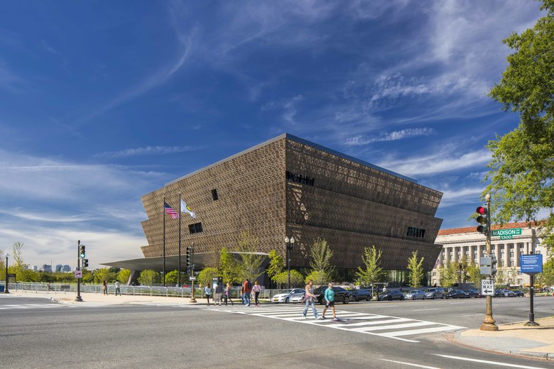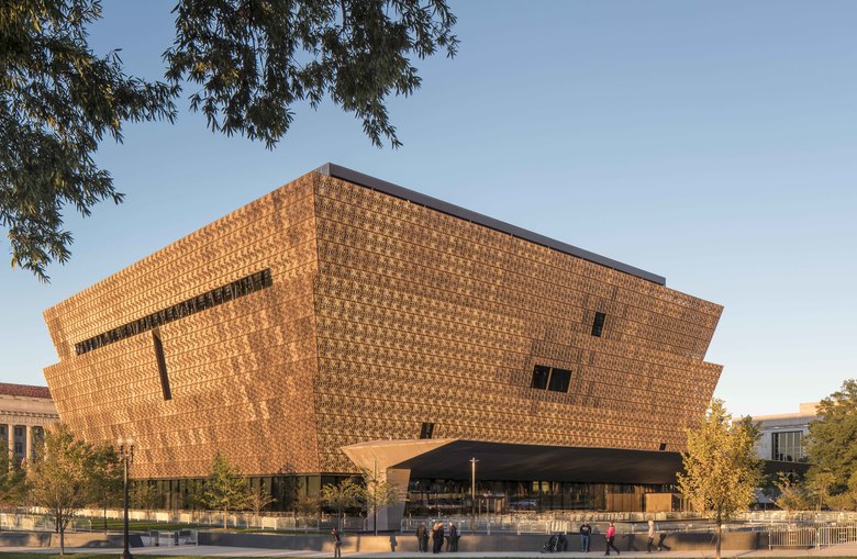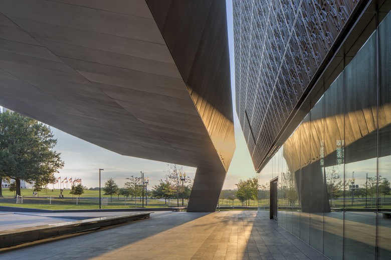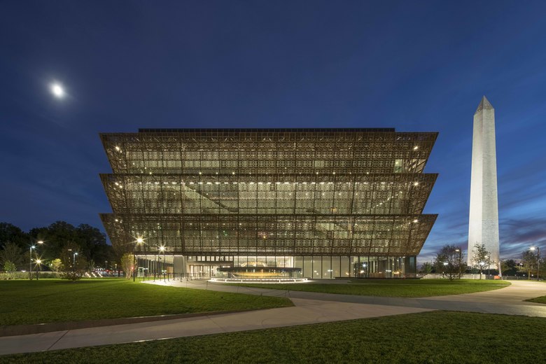 To stay true to the master plan of The Mall, to bridge the old world with the new, and to cover the vast amount of history and culture for this space; 60% of the museum is actually located below ground making it the deepest museum on The Mall at 70ft. deep (21 m). This allows for five stories above ground and five stories below ground. Slated for LEED Gold certification, the first Smithsonian ever to achieve such a status, the National Museum of African American History and Culture’s (NMAAHC) exterior skin helps this impressive project receive this status. Inspired by the three-tiered crop used in Yoruban art from West Africa, the ornamental bronze-colored metal lattice pays homage to the intricate ironwork that was crafted by enslaved African Americans in South. The lattice work itself opens the building to streaming exterior daylight and can be modulated according to the season. Allowing for a historical and emotional journey, the interior is characterized by vast, column-free spaces, and a material palette made up of pre-cast concrete, timber and glazed skin that sits within the bronze lattice work. Integrating its architectural form with its purpose and function, the NMAAHC tells a story, the American story, through the lens of African American history and culture.