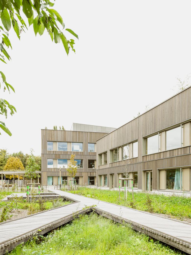 Die räumliche Gliederung der Schule in drei Baukörper, die durch transparente Brücken verbunden sind, führt zu einer klaren Orientierung und ermöglicht Sichtbeziehungen und Durchgänge zur Natur. Das Gebäude ist auf die Bedürfnisse von Kindern zugeschnitten.