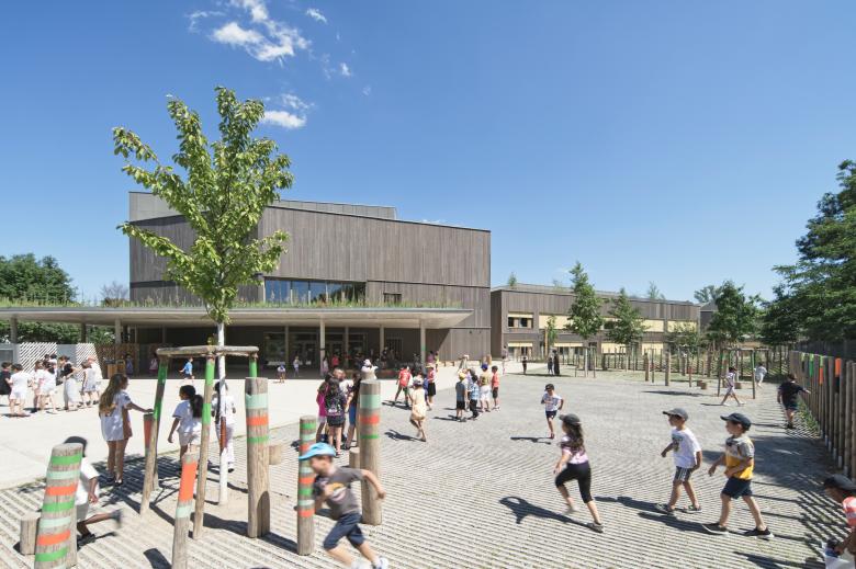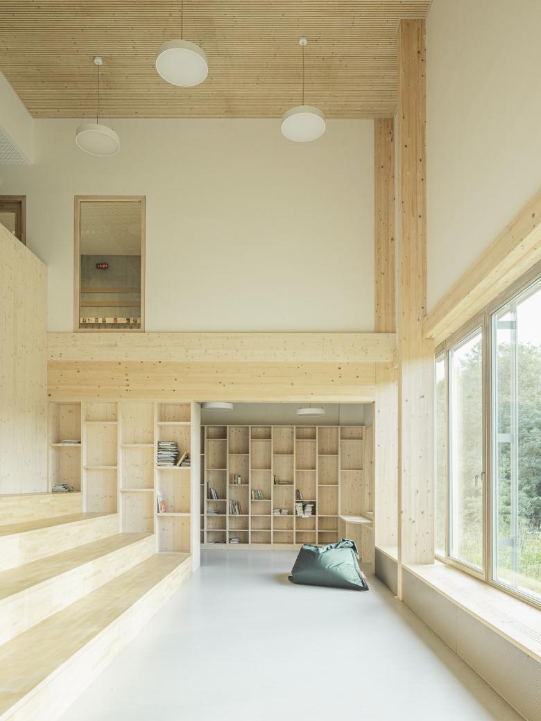 Der Außenbereich mit zwei Höfen, Biotopen und pädagogischen Gärten ist erweiterter Lern- und Spielraum für die Kinder. Im Inneren bildet die zweigeschossige, lichtdurchflutete Bibliothek das Herzstück der Volksschule.