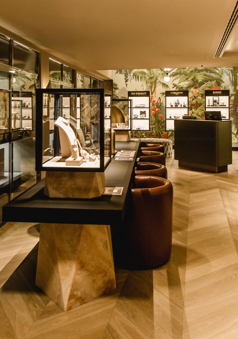 Die Flanierzone der Uhrenvitrinen wird mit einer handgemalten Panoramatapete mit üppigen Pflanzenmotiven inszeniert.