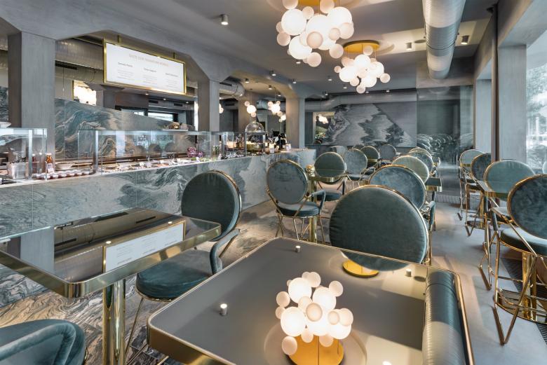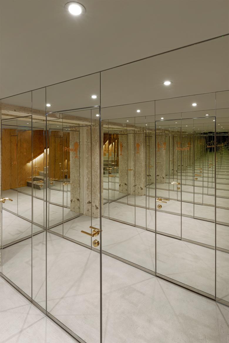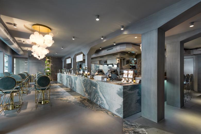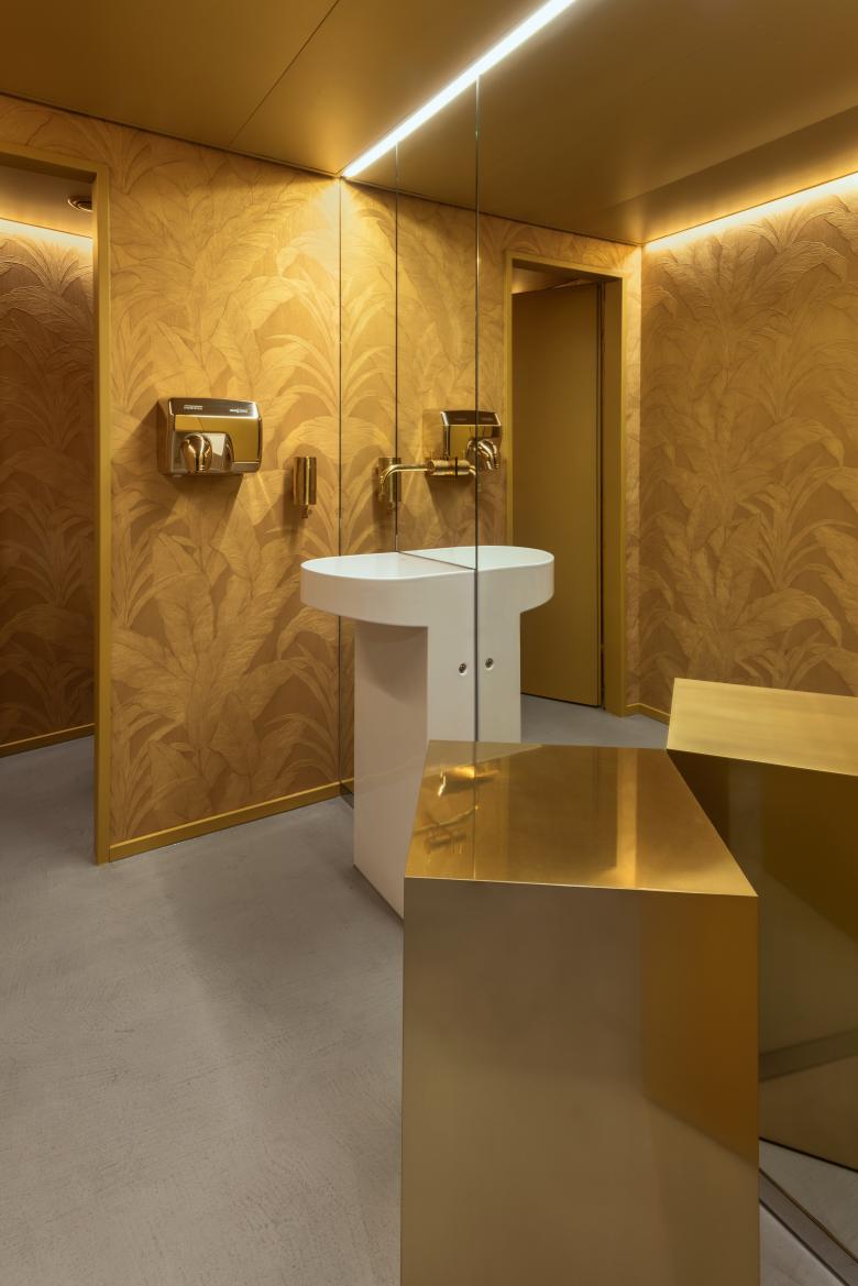 Der avantgardistische Stil der Bar – Lounge – Take Away setzt sich aus geometrisch abstrakten Strukturen in Marmor, Beton und weichen Oceanfarbtönen zusammen. Die güldenen Wände mit Bananenblatttapete führen hinunter in ein Spiegellabyrinth.