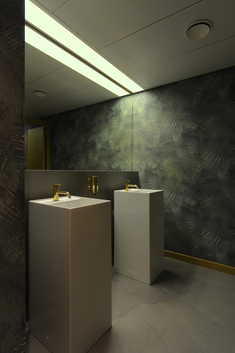 Blassgrüner Marmor mit Wellenmuster und Palmenmotive sorgen weiter für Südseefeeling.