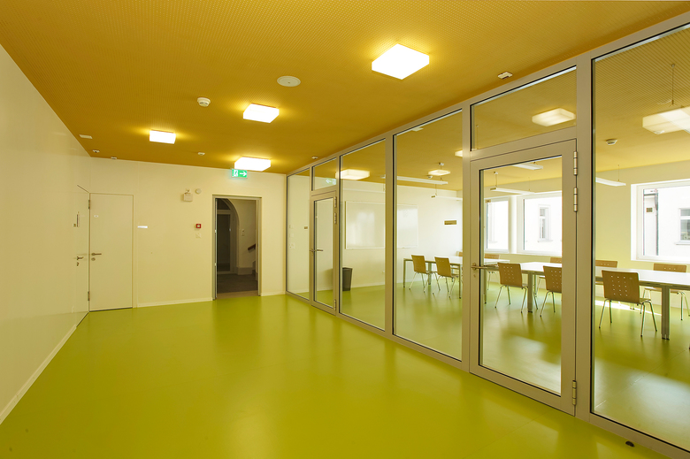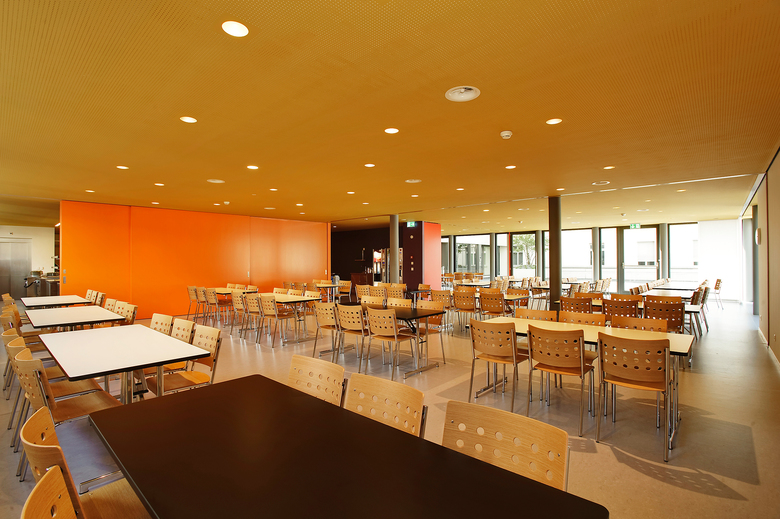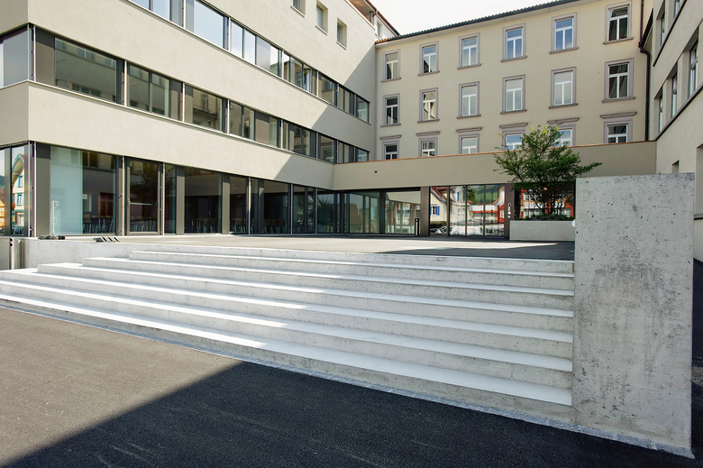 Die durchgehend gestaltete Erdgeschoss-Abwicklung von Klosterkirche, Friedhofmauer und Anlieferung via Mensa bis Haupteingang bildet die Nahtstelle zwischen der Schule und dem angrenzenden öffentlichen Raum.
