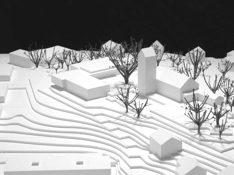 Die Verfasser teilen das Bauvolumen in zwei rechtwinklig angeordnete Baukörper auf und schaffen im Zusammenspiel mit der KIrche einen nach Nordwesten offenen Kirchplatz. Der vom Dorf abgewendete Kirchpatz ist ausnehmend schön gestaltet und die Materialanmutung passt gut zur öffentlichen Nutzung. Die beiden Baukörper sind sorgfältig entwickelt und die Makroöffnungen schaffen schöne Ausblicke. Die architektonische Gestaltung ist gekonnt umgesetzt und ermöglicht die angestrebte Ausstrahlung des Kirchgemeindehauses. Die reduzierte Gebäudehöhe ist ortsbaulich richtig, ist aber mit einer entsprechend grossen grundrisslichen Ausdehnung verbunden.