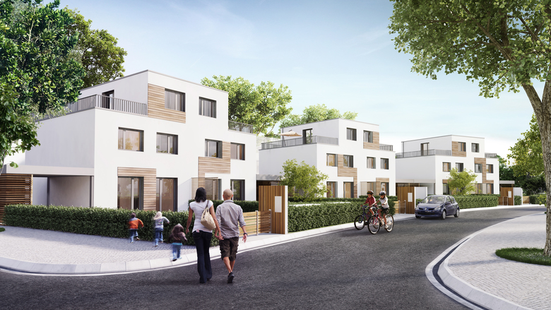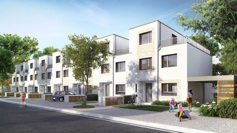 Ein architektonisch eigenständiges Esemble aus Ein- und Mehrfamilienhäusern bildet den städtebaulichen Auftakt für die Entwicklung des nördlichen Abschnitts im Offenbacher Baugebiet An den Eichen in Waldheim-Süd.