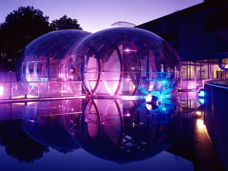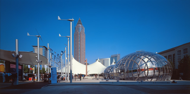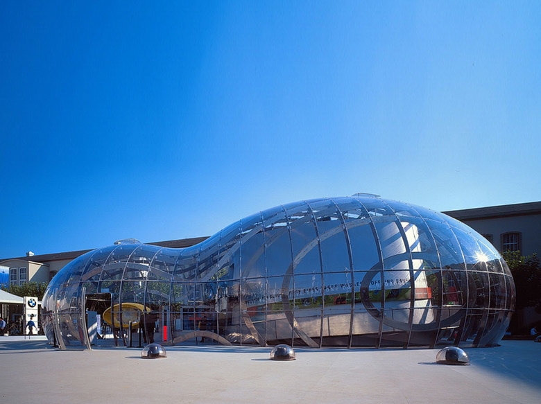 Lange bevor Nachhaltigkeit zum Modewort geworden ist, wird im ersten von Franken realisierten BMW Messeauftritt, das Fahren mit der „Clean Energy“ von Wasser und Sonne, symbolisiert in der Form eines ikonischen Gebäudes: ein Wassertropfen. Für die Erzeugung dieser Form dient ein Computerprogramm zur Tropfensimulation. Der Bubble war eines der ersten durchgängig vom Entwurf bis in die Fertigung digital gefertigten Gebäude weltweit.