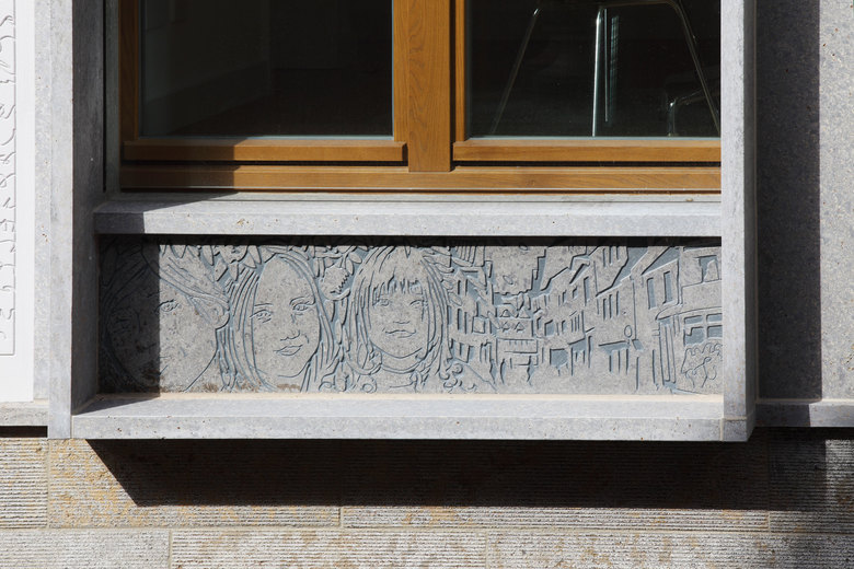 Für die Umsetzung in Putz entdeckte Franken Architekten StoDeco Plan, eine Granulatplatte des Putzspezialisten Sto, das dieser für die Rekonstruktion historischer Zierelemente und Leisten von Putzfassaden anbietet. Auf einer firmeneigenen Versuchsanlage des Bauherrn konnten auf Plattenrohlinge Muster mit einer 8 mm breiten und 5 mm tiefen Keilnut gefräst und in einem Probeaufbau montiert werden. Das Ergebnis war so überzeugend, dass der Hersteller Sto auf das von Franken Architekten entwickelte Verfahren aufmerksam wurde und mit viel Elan die endgültige Fertigung selbst übernahm. Der Datensatz für die 144 selbstähnlichen aber unterschiedlichen Platten wurde von Franken Architekten an Sto übergeben, der die Platten fertigte und an einen örtlichen Betrieb lieferte. Dieser montierte die Platten auf einem Wärmedämmverbundsystem. Das Nachbild des historisch unter Putz verborgenen unsichtbaren Fachwerkes wird nur durch den Schattenwurf der Keilnut sichtbar und wechselt je nach Lichtstand über den Tag hinweg sein Erscheinungsbild.