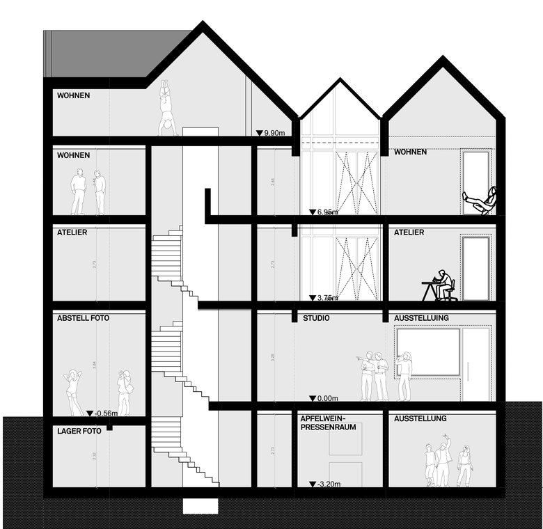Im Erdgeschoss befindet sich das Herzstück des Hauses: ein Raum für Happenings 2.0. Dieser besteht aus dem Fotostudio mit Ausstellungsräumen übergehend in eine offene Küche. Räumlich sind die beiden Bereiche über einen abgestuften Ebenenversatz mit eingelassener Sitzgelegenheit verbunden. Im Keller liegt eine Bar mit sichtbarer Apfelweinkelterei. In der Kleinen Rittergasse 11 verschmelzen privater und öffentlicher Raum. Die Bewohner mischen sich mit der Stadtbevölkerung. Es entsteht ein Community Space. Partizipativ und lässig exklusiv.