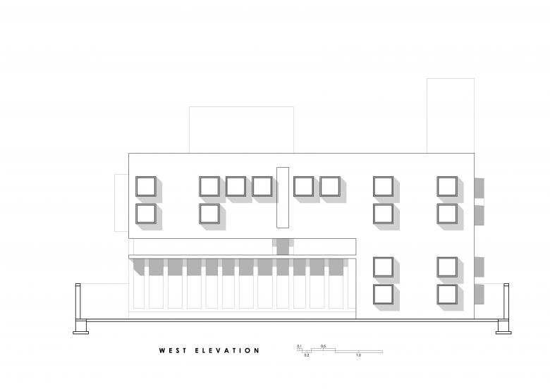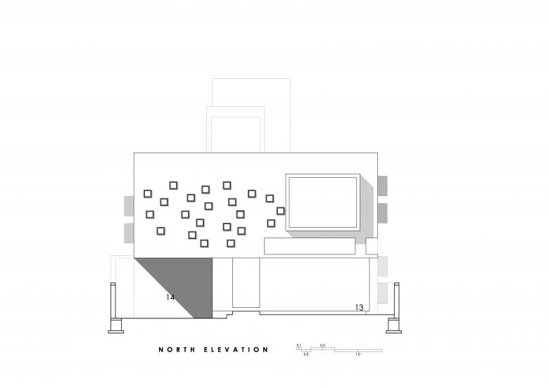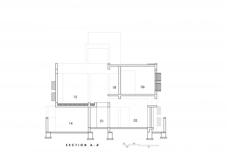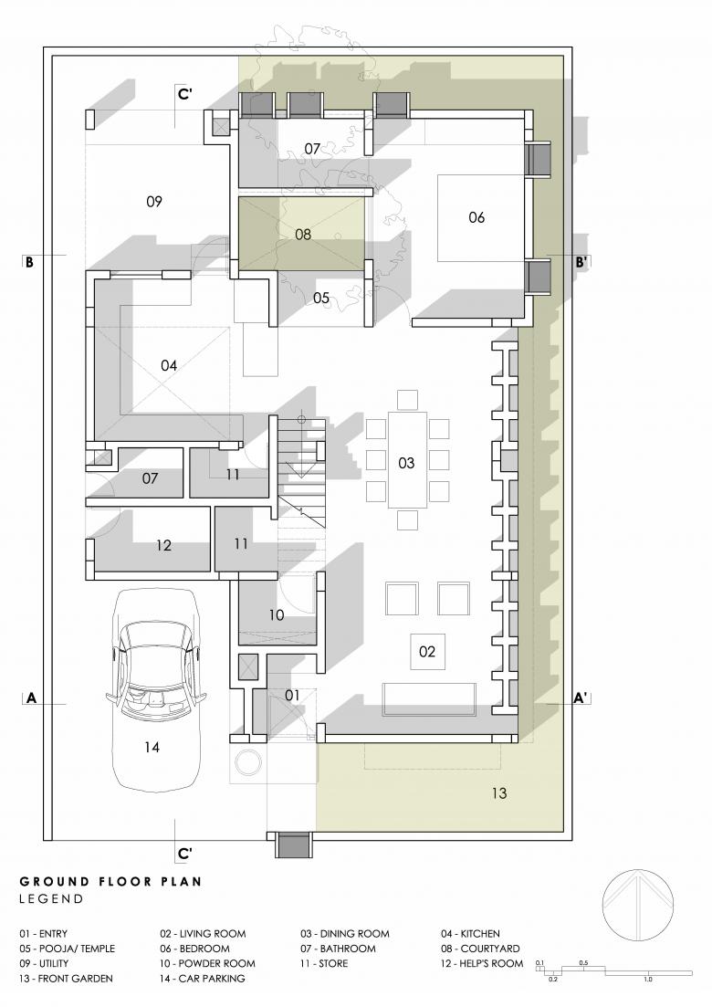 The Western block of the house is more traditional in terms of the stack. The Entry has a skylight from which one sees the plants above, on entering the house. It leads to large and long Living and Dining space which becomes the more formal and grander part of the house. The grandparents' bedroom is at the southern end of this block.