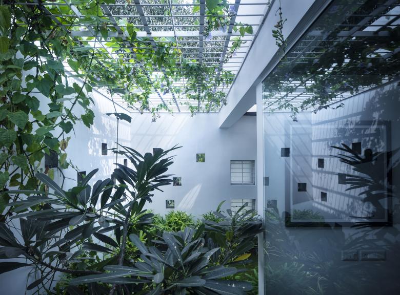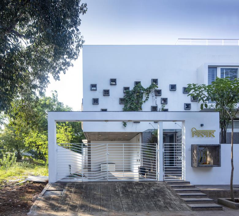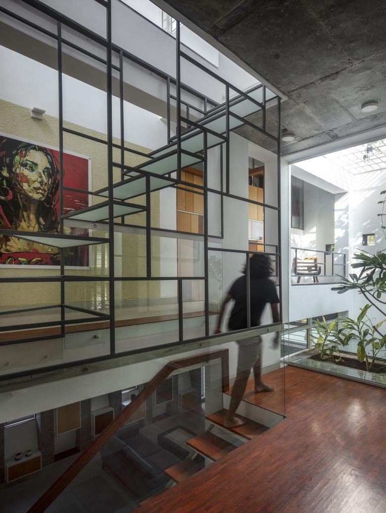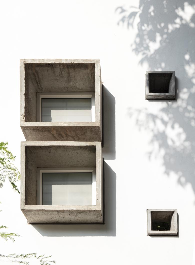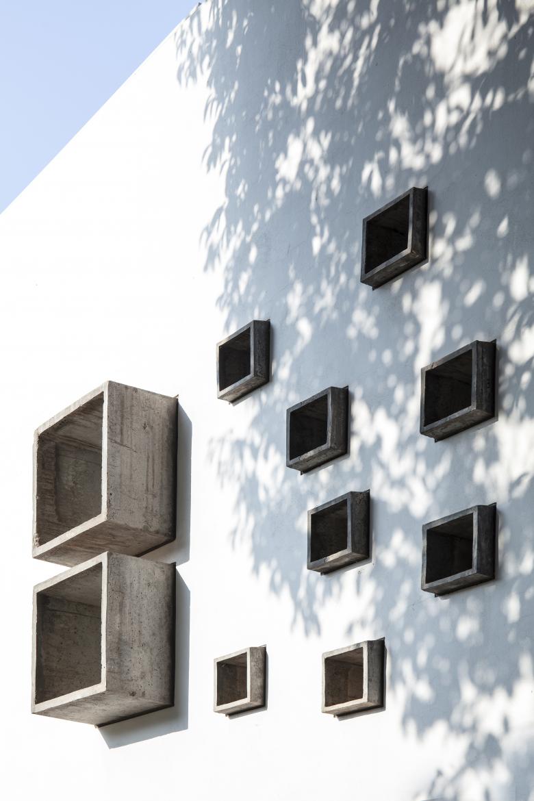 The house is designed to stave off the outside heat and create cool currents within it so as to form a convectional micro-climate. The outside walls wrap the house in this gesture of protection, pierced only with small and mass produced precast concrete windows that dot this exterior. The windows are kept small with heavy eaves to keep away the harsh sun.