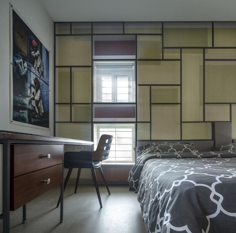 The mezzanine Bedroom is especially designed to 'keep an eye' on the old grandparents residing in the ground floor bedroom through a small courtyard which also serves as their 'private' garden, a light well and a back drop for Pooja / Temple.