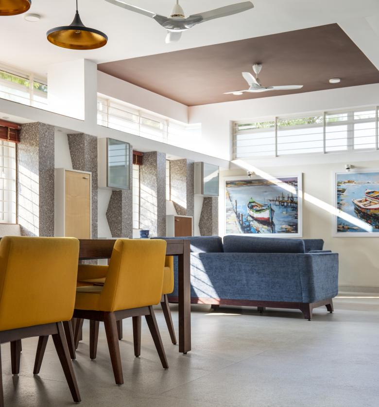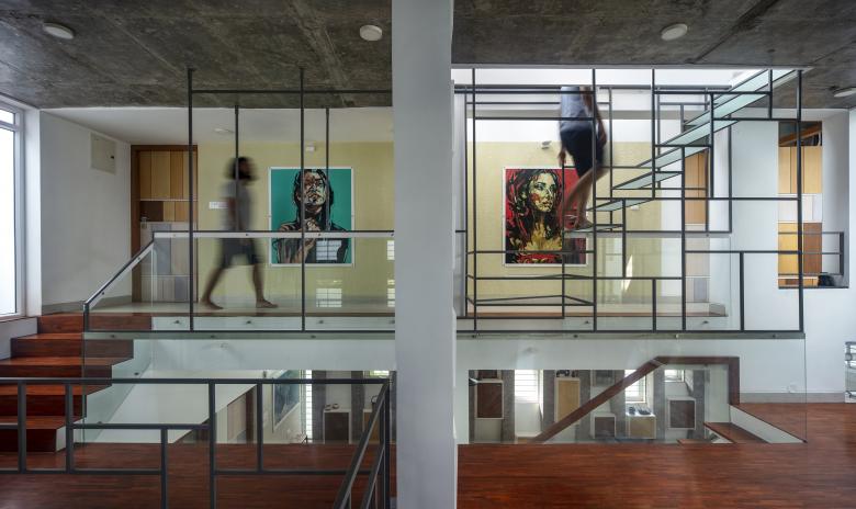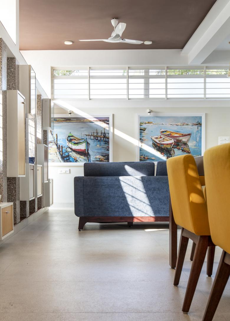 The mezzanine becomes the catalyst in developing the spaces of this house, as it hovers in between the long and open living cum dining on the ground floor and the private bedrooms on the first floor. The low height scales down the house, personalizes the gaze lines of interactions and dissolves the spaces as a gradation rather than a stack.