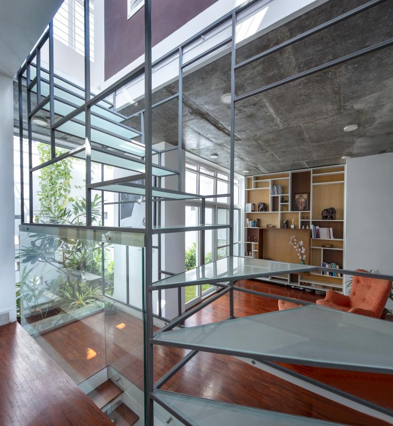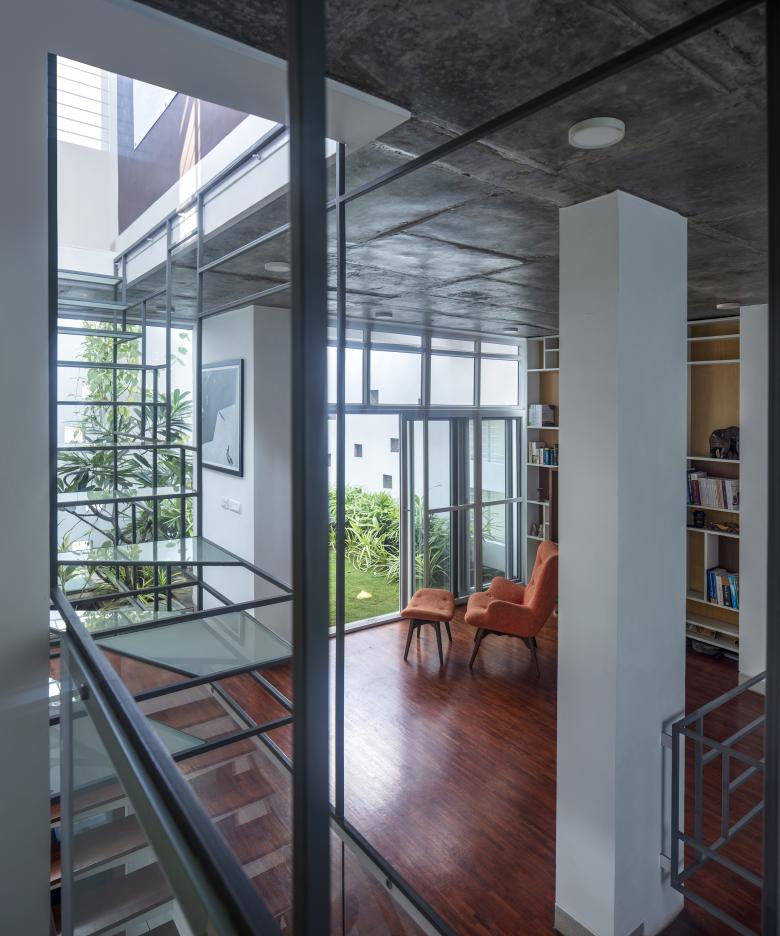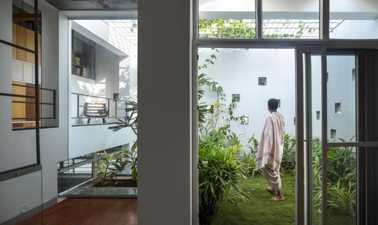 A elevated garden is set in the north east corner as a generator of this microclimate. It is kept open to sky in the shadow of the sun to create currents that flow through the house, just like the light that reflects into the house of its cool surfaces. This Terrace garden is on a mezzanine level as its serves both the ground and the first floor with this generosity of spirit and soft textures.