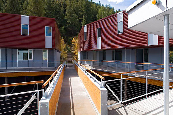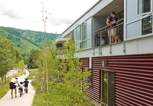 The design negotiates a steep, difficult site and transforms it into a dense, dynamic family complex complete with 14-three bedroom units, 25 covered parking spaces, an open space parcel and a network of public trail easements. The site for this project was an unwanted brown field site which was considered difficult to develop due to its steep elevation, the presence of mine waste rock and rock shafts as well as potential rock fall from above. A partnership was formed with the City of Aspen, which subsidized the project.