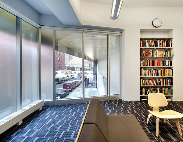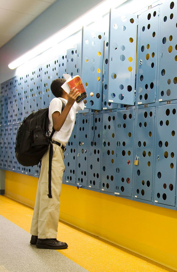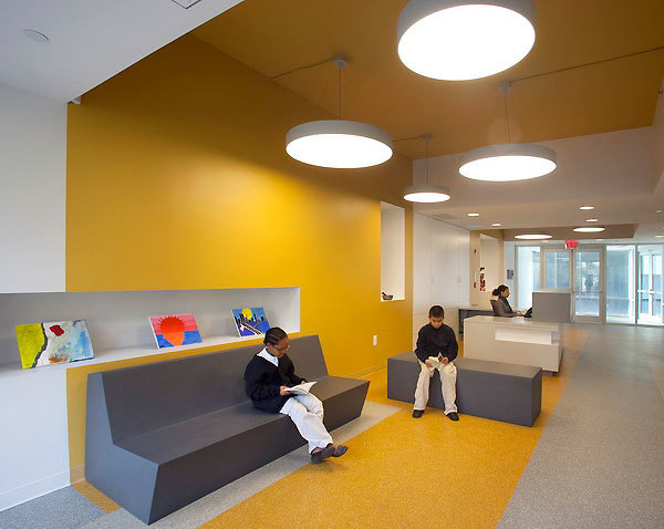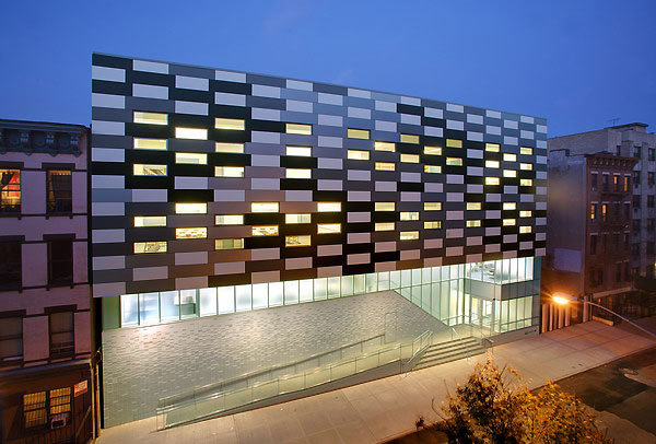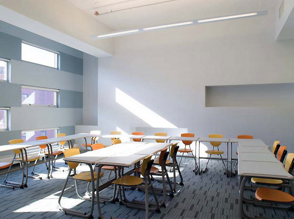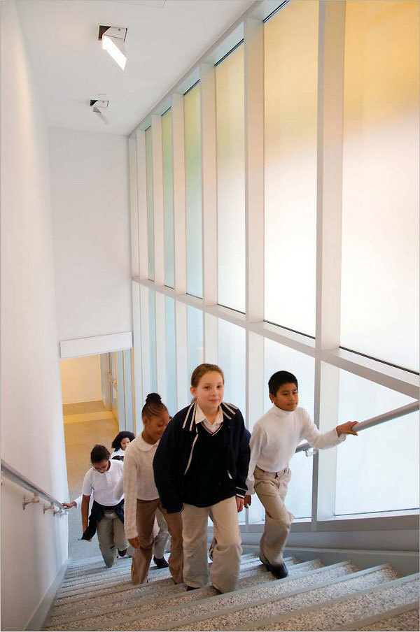 This dual purpose is echoed in the design of the building. The lower floors, which are linked by a formal public stair visible from the street, contain public spaces: a large cafeteria, gymnasium and entrance lobby. These floors are sheathed in translucent, acid-etched glass through which the daily activities of students and teachers are visible from the street. The upper floors contain classrooms and other academic spaces, which are veiled by a composition of windows and panels of varying colors and degrees of reflectivity. This fabric-like screen marks the sheltered isolation needed for the serious work of learning, study, and discipline that goes on in those spaces. As part of the pixelated façade, window openings are placed in relation to interior planning rather than imposing any formal exterior logic. On the interior, the outside walls of the classrooms are composed of staggered rectangles of alternating windows and colored panels that are used as tack boards for instructional materials and other displays.