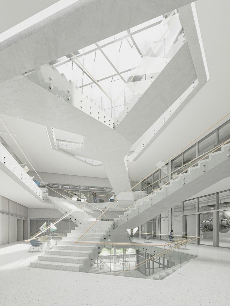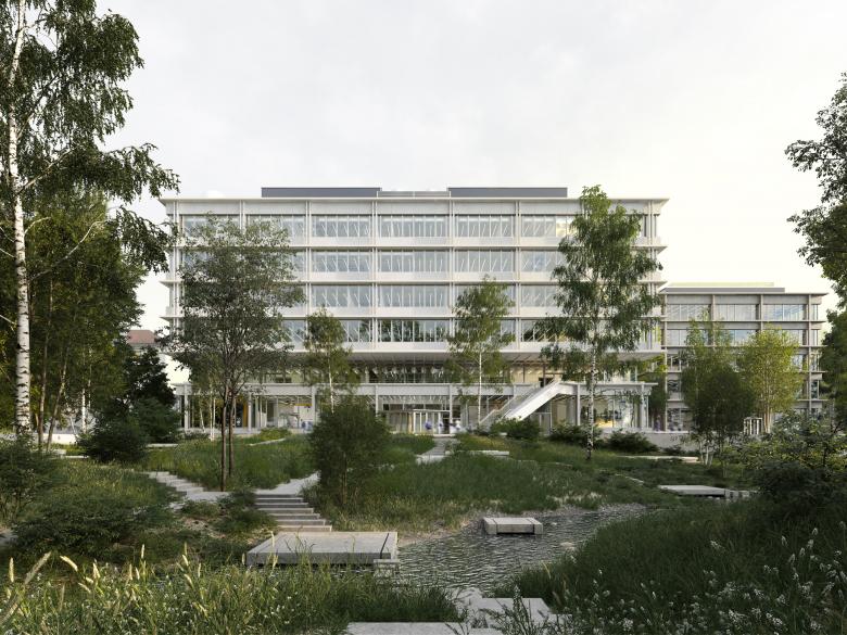 Die erste von vier Etappen legt zwei neue Achsen fest / Technische Innovation, die die zukünftige Arbeit in den Labors und Werkhallen prägt, widerspiegelt sich in der architektonischen Übersetzung / Auf der Basis eines Gebäuderasters sollen eine hochflexible modulartige Raumaufteilung und somit eine Vielfalt an unterschiedlichen betrieblichen Szenarien möglich sein, um sich verändernden Bedürfnissen gerecht werden zu können / Dank einer Auskragung wird das Mensa-Gebäude mit dem Park verbunden und als neue Mitte auf dem Areal etabliert.
