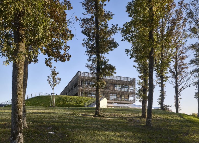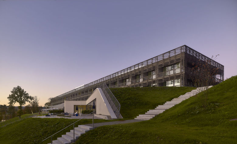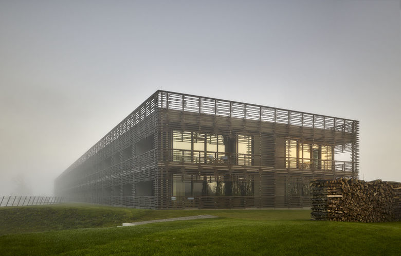 The below-ground infrastructure linking the administrative areas, spa and conference areas is minimal. A penthouse and bar will be constructed on the roof at a later stage. The woodland on the west side has been thinned out to provide more views of the lake, and the wood used for the façade of the hotel. The timber slats of the façade have been charred, lending the building a silvery-black shine.