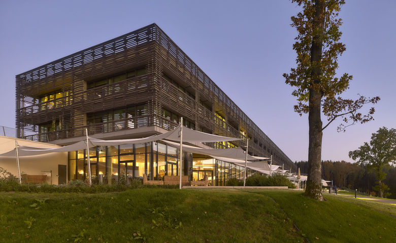 From the lobby, guests can proceed onto the restaurant, bar and reading room or to the conference spaces and spa. These functional spaces, as well as the administrative facilities, are embedded in the topography of the hilly landscape. The 2,000 m²-large spa and wellness area faces onto the surrounding woodland to create a sheltered, private environment of high-quality indoor and outdoor spaces. The restaurant, conference areas and some parts of the spa open onto the lake, and enjoy an incredible panoramic view.