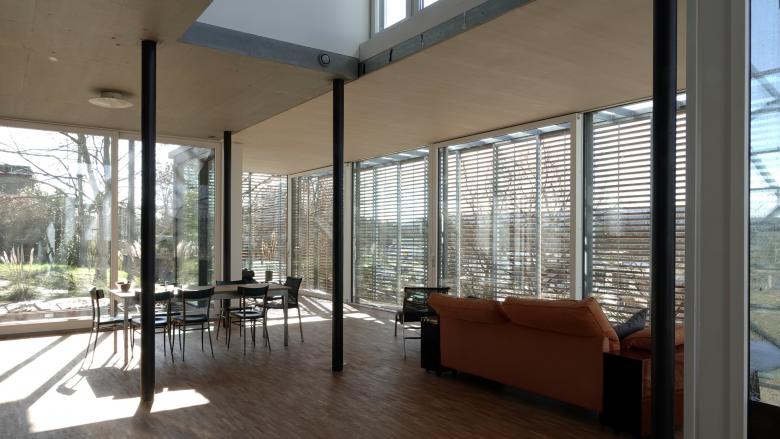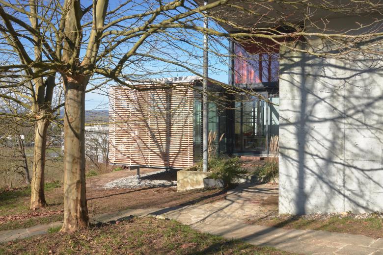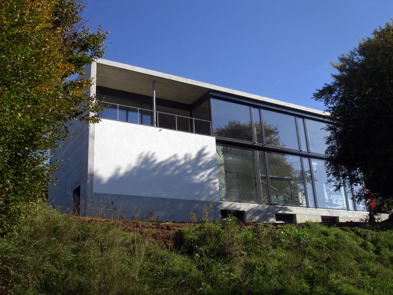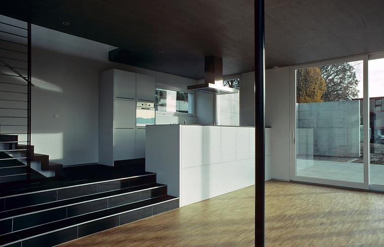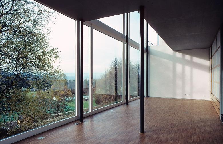 Das Haus liegt an bester Lage parallel zum Hang. Das Dach ist ausladend über den seitlichen Sitzplatz gezogen und schafft mit dessen Umwandung einen schönen Aussenraum. Auch innen ist dar Raum über eine Galerie bis unter das Dach erlebbar. 13 Jahre später wurde eine Ess- und Wohnraumvergrösserung gewünscht. Ein vorgelagerter, transparenter Baukörper konnte durch dessen versetzte Anordnung den seitlichen Aussenhof geborgener wirken lassen. Auf der anderen Seite blieb dadurch die Talsicht unverbaut.  Die Schiebewände, welche mit Holzlamellen eingekleidet sind, erzeugen nicht nur ein schönes Lichtspiel, sondern auch die Talsicht bleibt so auch bei starker Sonneneinstrahlung jederzeit frei.