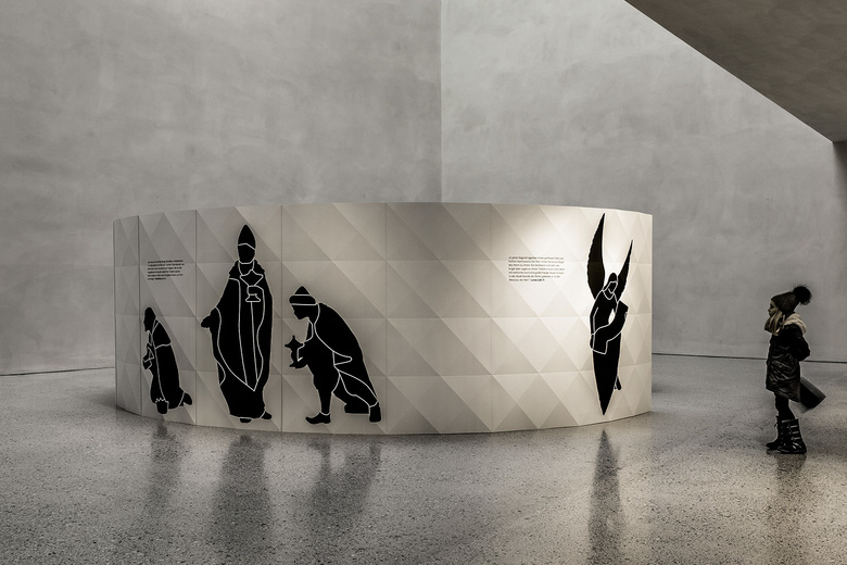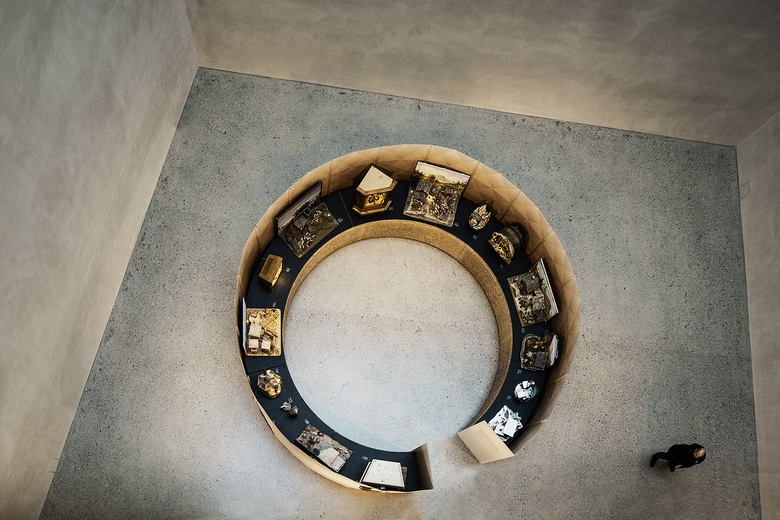Die minimale Konstruktion und die Verwendung von ausschließlich wiederverwertbarem Material tragen sowohl ökonomisch als auch ökologisch der kurzen Ausstellungsdauer von 6 Wochen Rechnung. Gekantetes Material umschließt das kreisrunde Ausstellungspodest und schafft einen intimeren Ausstellungsraum inmitten des 23 m hohen Atriums.
