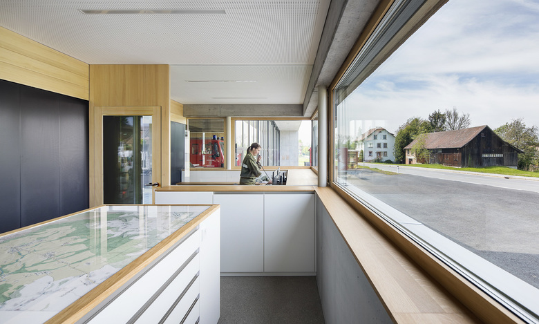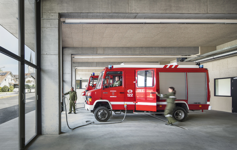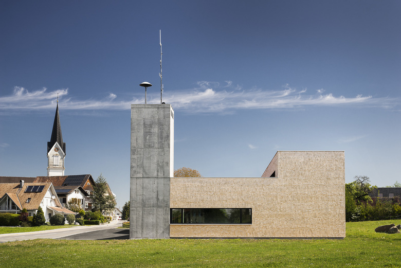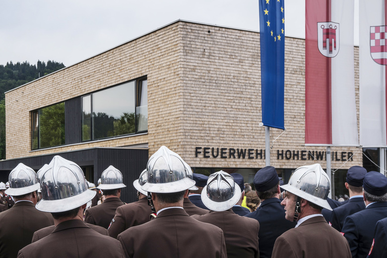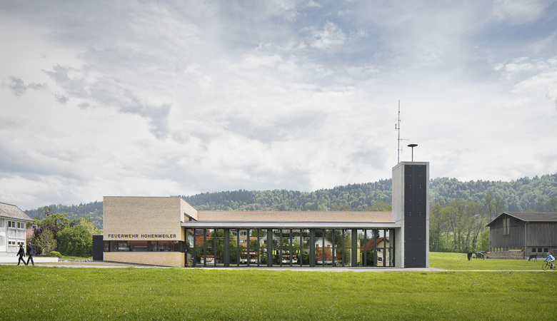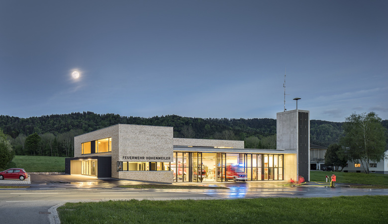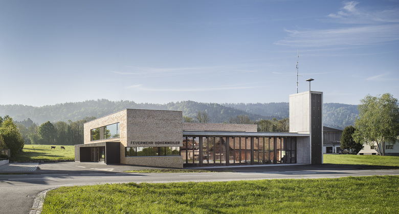 Das Grundstück für den Neubau des Feuerwehrhauses Hohenweiler liegt an der Landesstraße unmittelbar am Eingang zum eigentlichen Ortszentrum. Durch die Positionierung des 12m hohen Turms ortsauswärts gelingt es, städtebaulich den Beginn des tatsächlichen Ortszentrums im stark zergliederten Gemeindegebiet zu markieren. Gemeinsam mit dem Kirchturm auf der anderen Straßenseite bildet er einen der Hochpunkte im Dorfgefüge.